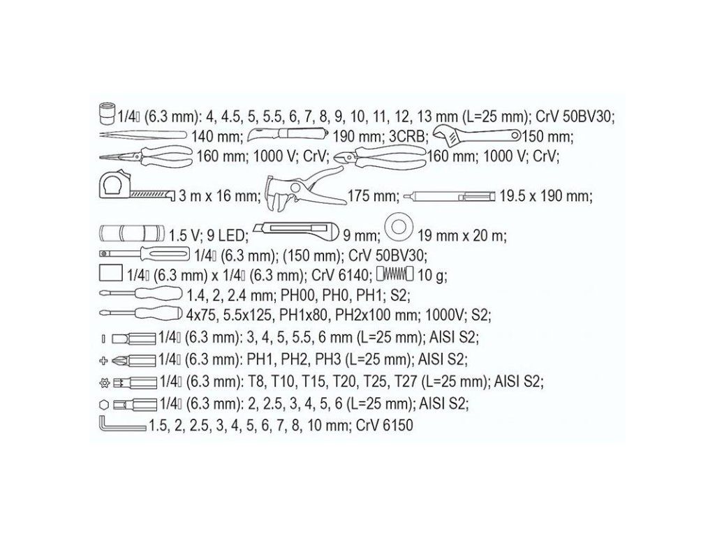 - Krížové bity 1/4": PH1, PH2, PH3 (AISI S2)