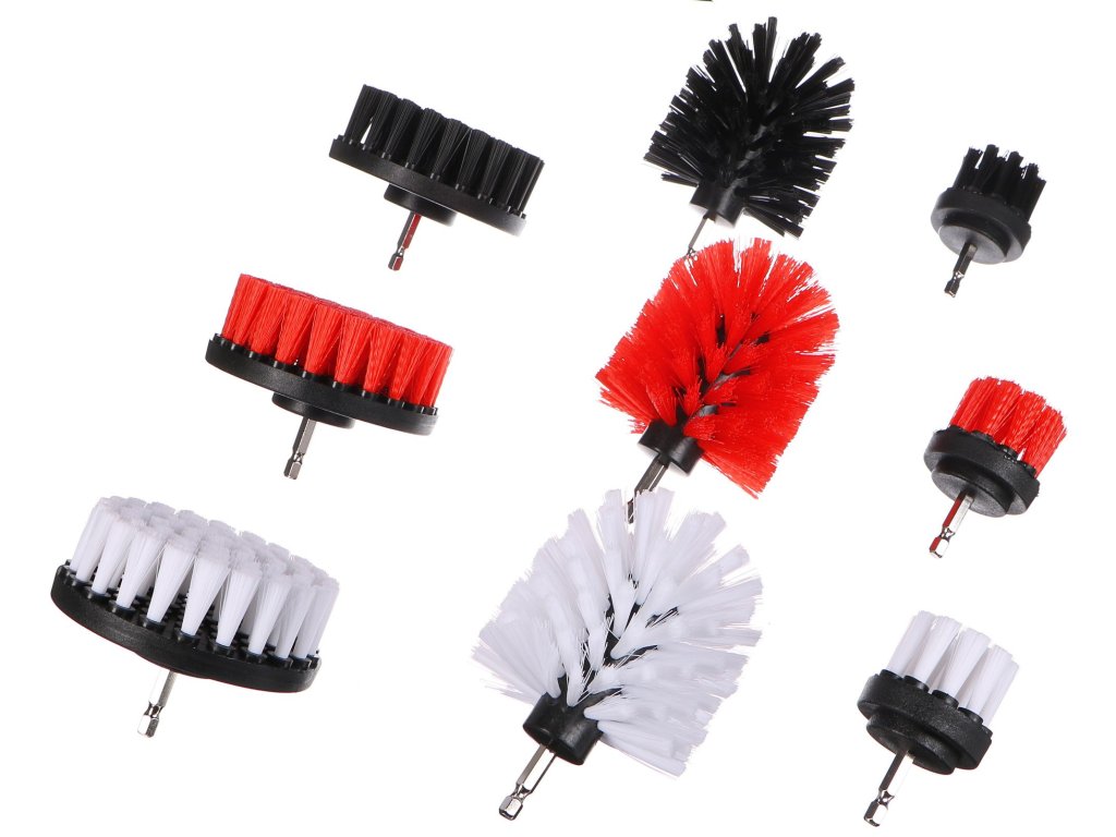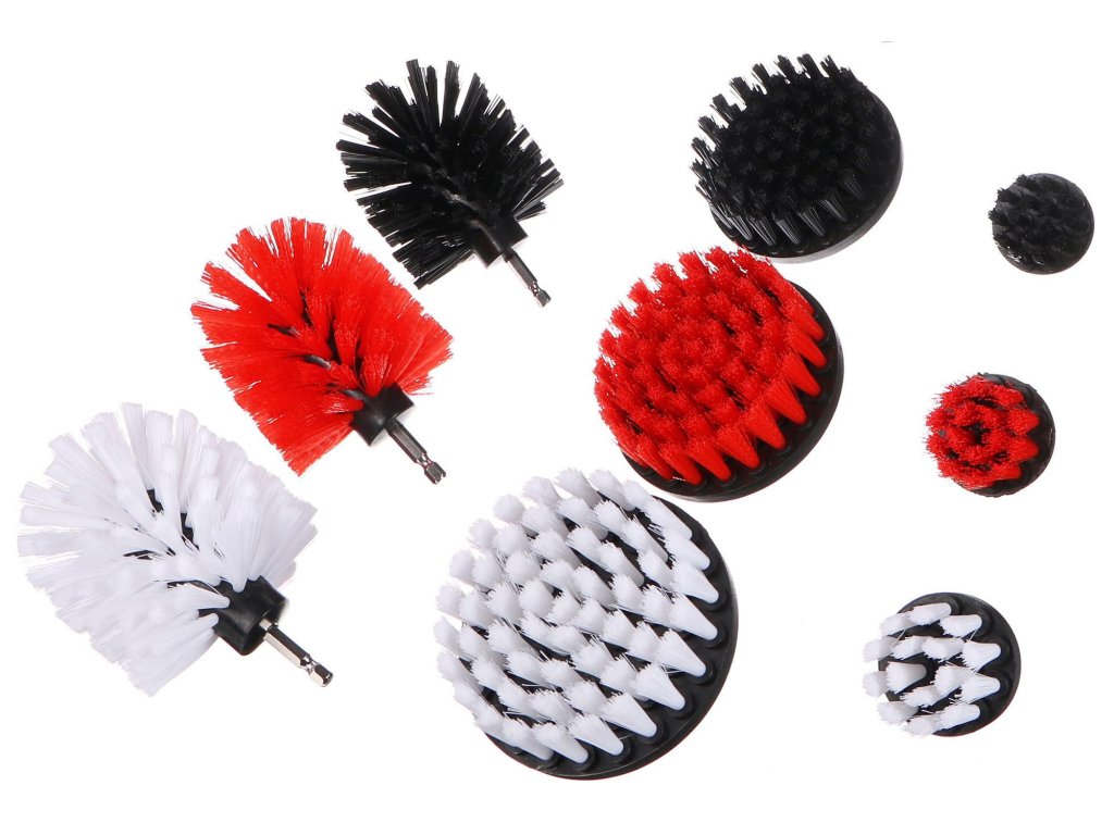 Kompletní sada rotačních čistících kartáčů na vrtačku DRILL BRUSH 9 o devíti kusech určená k čištění ráfků kol, podvozku, částí motoru a dalších tvrdých povrchů. Sada obsahuje 3 tvrdé (černé), 3 středně tvrdé (červené) a 3 měkké (bílé) kartáče, které lze využít nejen k čištění auta, ale jsou vhodné také pro čištění tvrdých povrchů v domácnosti jako jsou obklady v kuchyni a koupelně, toaleta, vana, dílna nebo pro čištění zahradní techniky.Hlavní výhody: