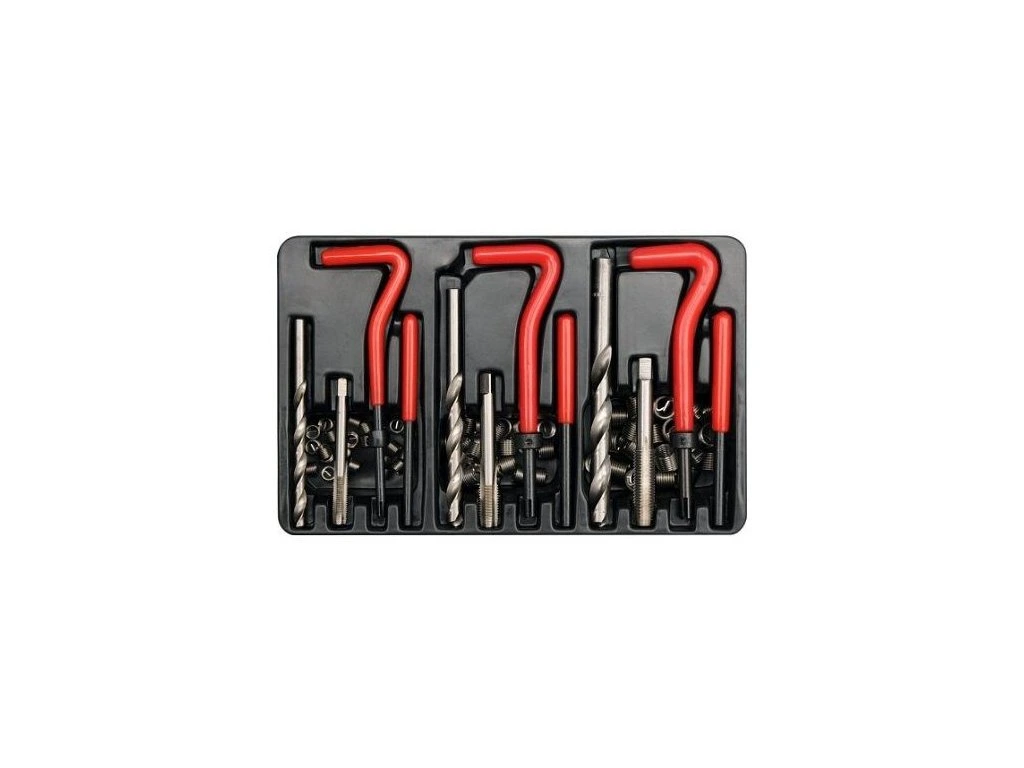 Opravná sada poškozených metrických závitů je určena všude tam, kde při poškození závitu nelze použít šroub jiného rozměru, než byl původní. Dále lze závitové vložky využít pro výztuhu závitů v materiálech s nízkou pevností ve střihu například alu nebo hořčíkové slitiny. Obsahem sady pro každý druh závitu je vrták, závitník, zavádeč, vyrážecí trn a závitové vložky z nerezové oceli. Vložky M6 – M10 jsou v balení 25 kusů.