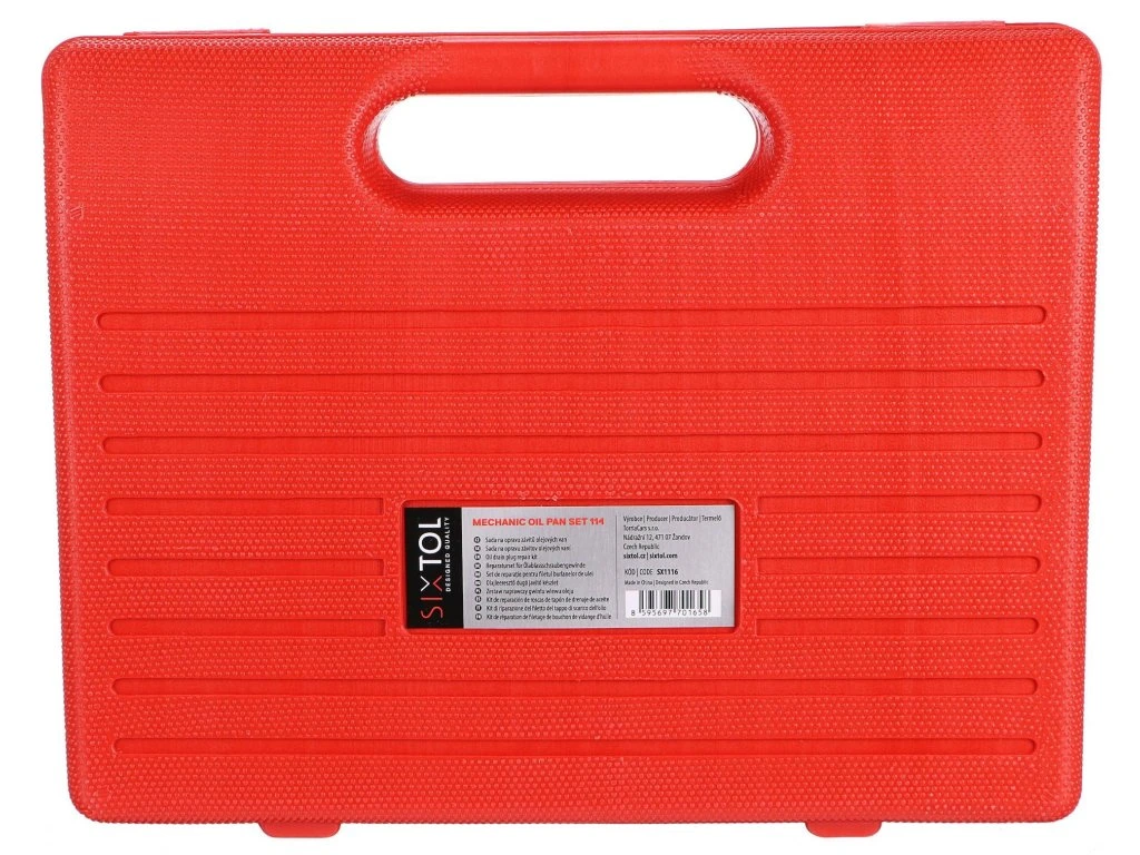 Kvalitní sada nástrojů na opravu poškozených závitů olejových van SIXTOL MECHANIC OIL PAN SET se 114 díly uložená v praktickém plastovém kufru. Tato sada obsahuje závitníky, šrouby a podložky ve velikostech M13 - M22 z odolné HSS oceli, které jsou vhodné pro většinu aut nejen při opravě poškozených závitů olejových van, ale také výpustných a kontrolních šroubů převodovek, diferenciálů nebo převodovek. Pomocí závitníku jednoduše vyříznete o 1 mm větší závit a našroubujete příslušný šroub. Velikostní rozsah v této sadě umožňuje její použití na většině automobilů a dodávek na trhu. Díky této sadě budete mít všechny potřebné nástroje pro snadnou a efektivní opravu závitů olejových van.Hlavní výhody: