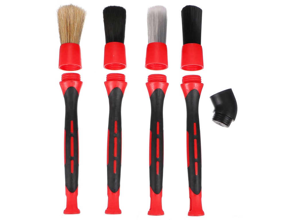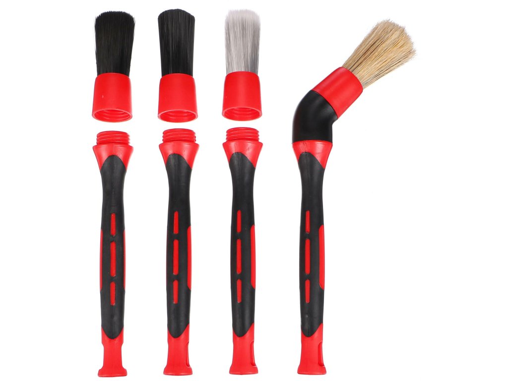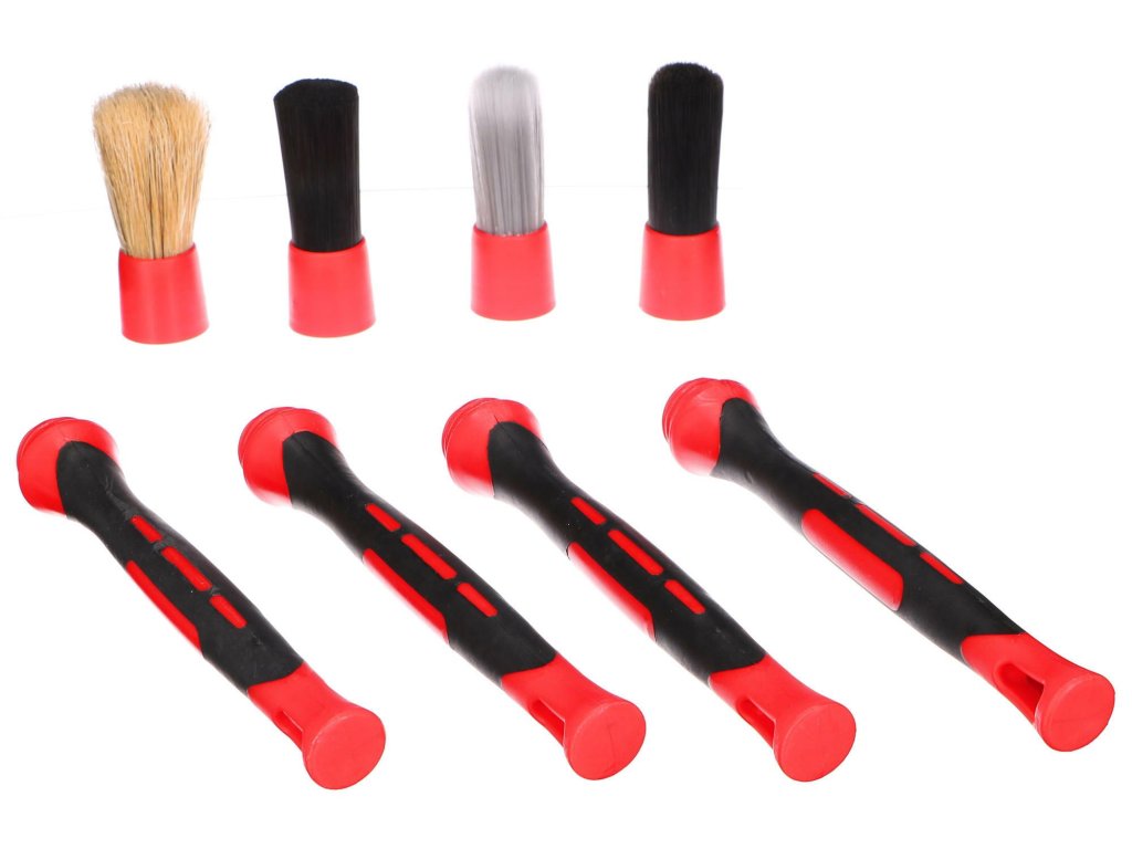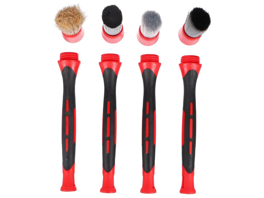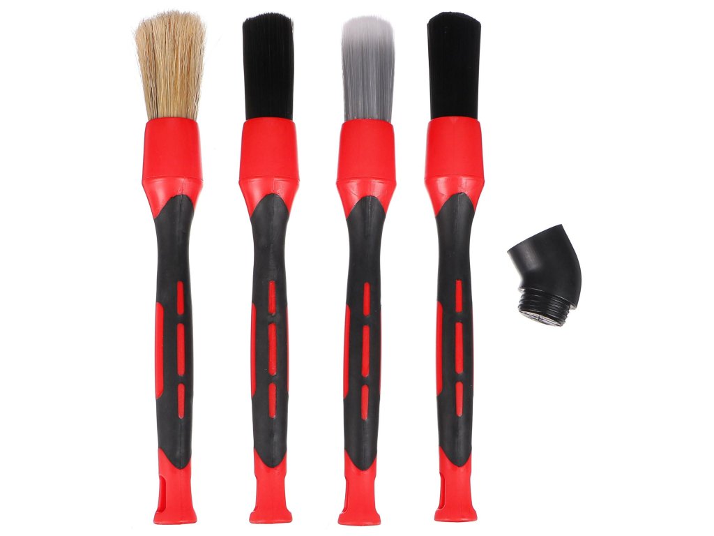 Praktická sada precizních štětců CAR DETAILING BRUSH 4 se čtyřmi vyměnitelnými nástavci je ideální volbou pro detailní a efektivní čištění vašeho vozu. Obsahuje 4 různé nástavce, které umožňují snadné a důkladné čištění i těžko přístupných míst, jako jsou například větrací otvory, štěrbiny mezi sedadly nebo v palubní desce. Každý kartáč je opatřen štětinami z jiného materiálu - prasečí štětiny, polypropylen, ostré hedvábí a syntetické hedvábí. Měkké štětiny šetrně odstraní prach a nečistoty, aniž by poškrábaly povrch, a jsou vhodné pro interiér vozidla. V sadě je také 45° nástavec propřístup do špatně dostupných míst. Ergonomický design rukojetí zajišťuje pohodlné držení. Tato sada je nepostradatelným pomocníkem pro každého, kdo si zakládá na čistotě a detailu.Hlavní výhody: