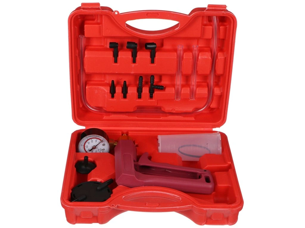 Servisní 17dílná sada pro podtlakové/vakuové testování brzdových systémů MECHANIC BRAKE TESTER 17 je důležitým nástrojem pro diagnostiku a údržbu brzdových systémů v různých typech vozidel. Tato sada umožňuje provádět podtlakové/vakuové testy, aby se zjistily potenciální problémy s brzdovým systémem, jako jsou prasklé hadice, netěsnosti, nebo poruchy v brzdovém posilovači. Sada obsahuje pumpičku, dvě dlouhé elastické hadičky, dvě krátké elastické hadičky, nádržku na provozní kapaliny, dvě víčka a sadu svorek a konektorů. Tato sada slouží k testování tlaku a podtlaku u podtlakového magnetického ventilu, MAP senzorů, palivové nádrže a odvzdušnění brzdových systémů. Nástroje jsou uloženy v plastovém kufříku, který usnadňuje jejich skladování a přenos.Hlavní výhody: