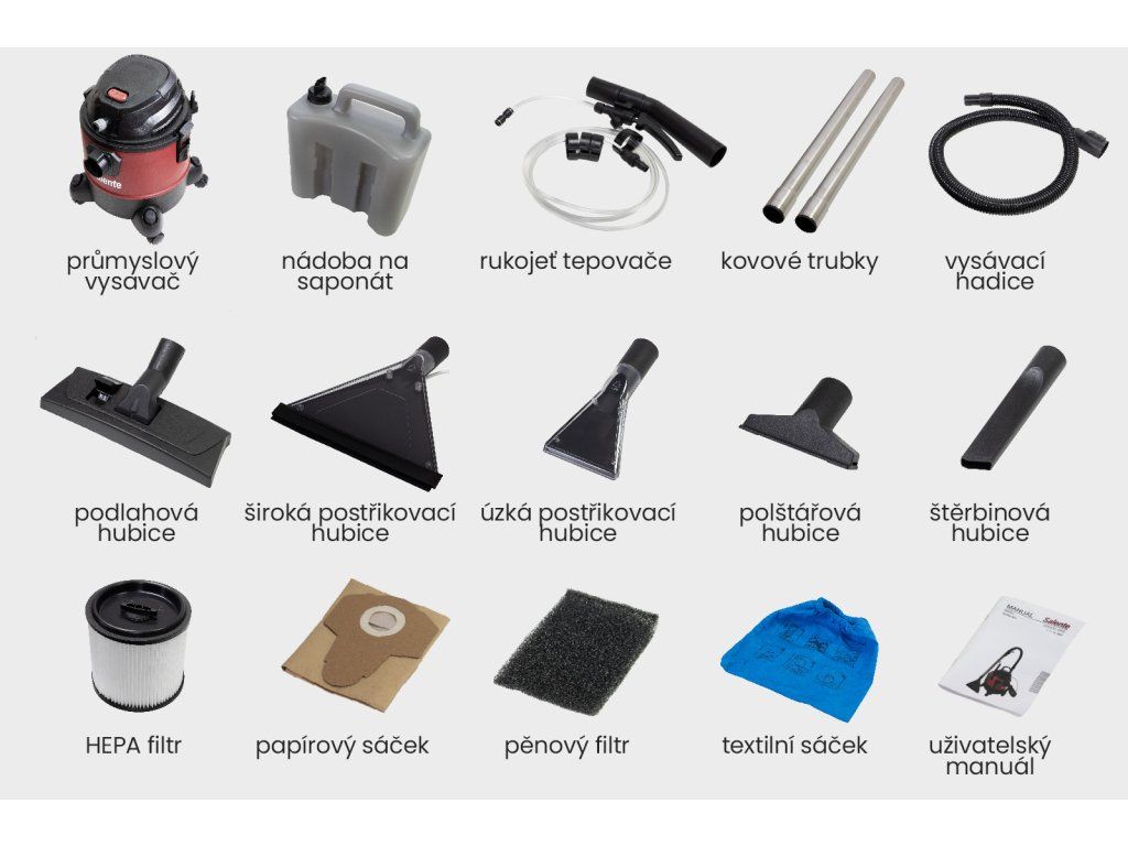 • Průmyslový vysavač • Nádoba na saponát • Rukojeť tepovače • Kovové trubky • Vysávací hadice • Podlahová hubice • Široká postřikovací hubice • Úzká postřikovací hubice • Polštářová hubice • Štěrbinová hubice • Hepa filtr • Papírový sáček • Pěnový filtr • Textilní sáček • Uživatelský manuálPŘÍPLATKOVÉ PŘÍSLUŠENSTVÍ: