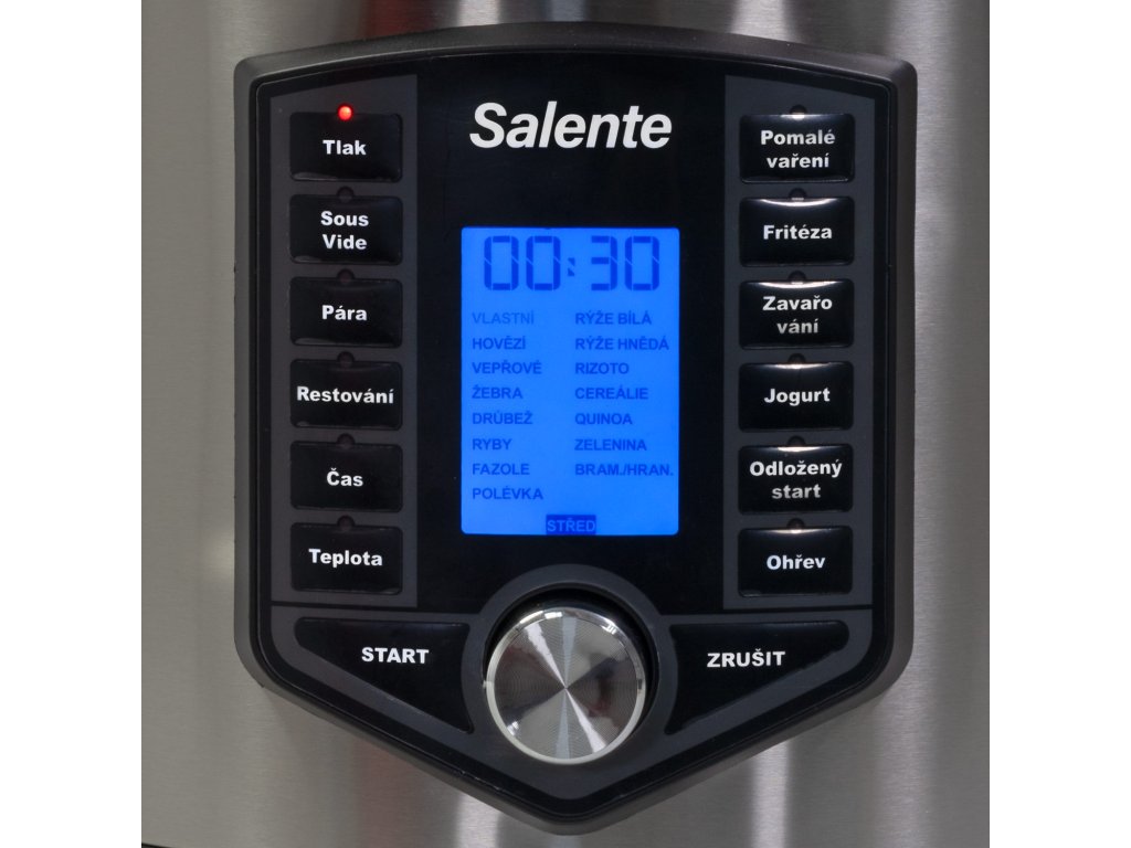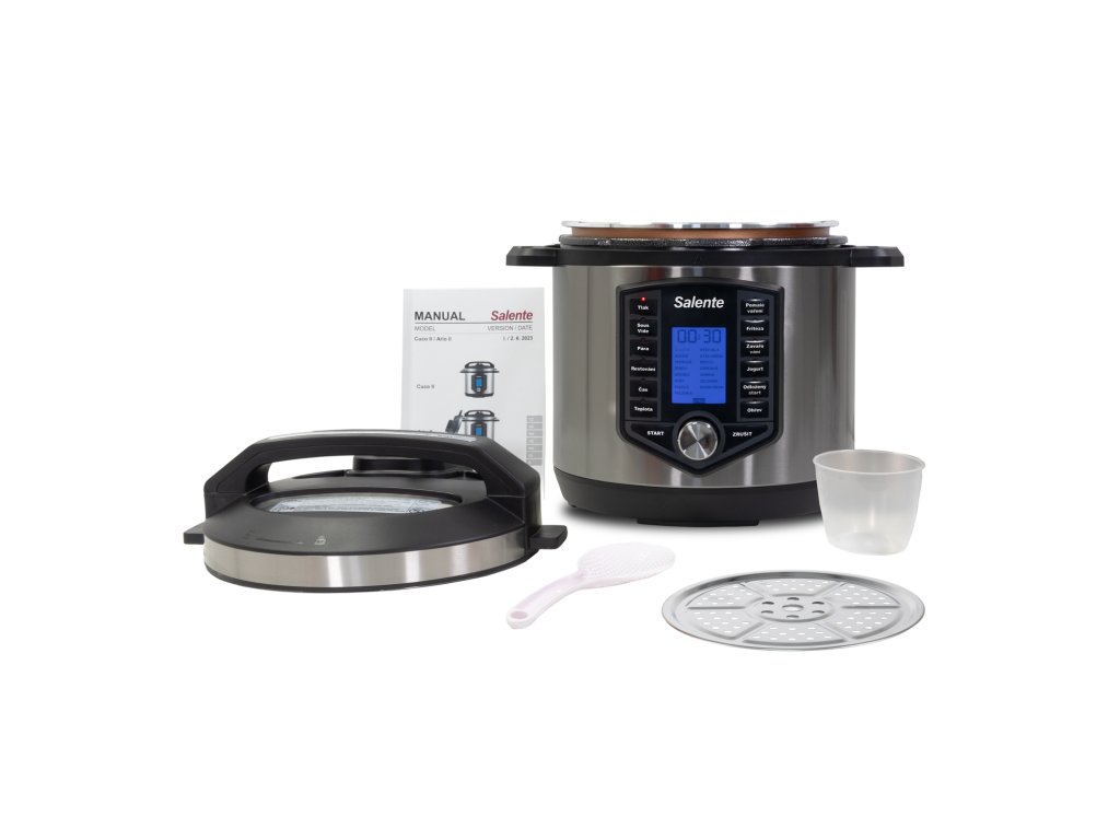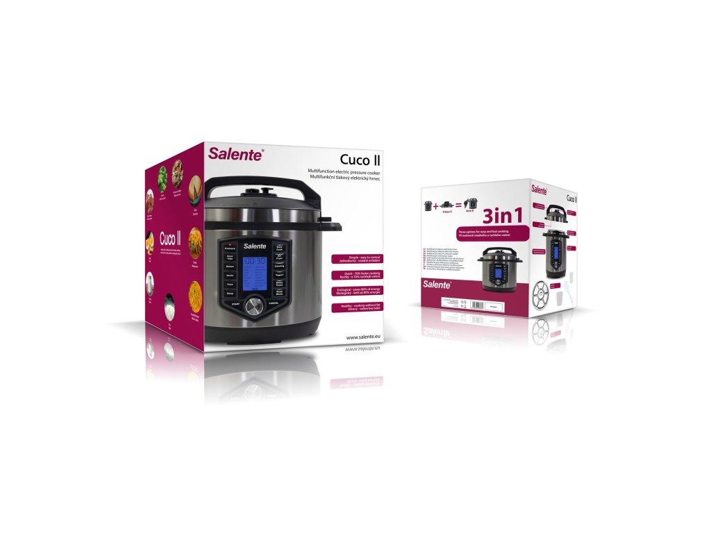 • Salente Cuco II je přizpůsoben pro co nejsnadnější ovládání, proto jsou všechny ovládací prvky v českém jazyce včetně návodu. • 11v1: tlakový hrnec, pomalý hrnec, rýžovar, jogurtovač, vařič vajíček, ohřívač jídla, pánev na smažení nebo restování, napařovací hrnec, sterilizátor, hrnec na zavařování, hrnec na sous-vide • Vnitřní napařovací plát vyjímatelný vyrobený z kvalitní nerezové oceli • 53 programů pro efektivní vaření • Nádoba o objemu 6l - umožňuje vaření pro celou rodinu (2 - 6 osob), vhodná do myčky • Možnost nastavení odloženého startu (až 24 hodin) a tlaku - vysoký/nízký/střední • 9 ochranných prvků pro bezpečné vaření - CE certifikace, řízeno mikroprocesorem • Velký a přehledný LED displej s podsvícením • Ekologické vaření - ušetříte čas i peníze, o 80% nižší spotřeba elektrické energie • Velmi snadná obsluha i ovládání • Multifunkční • Tlačítka i návod v českém jazyceTECHNICKÉ SPECIFIKACE: