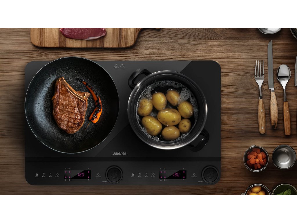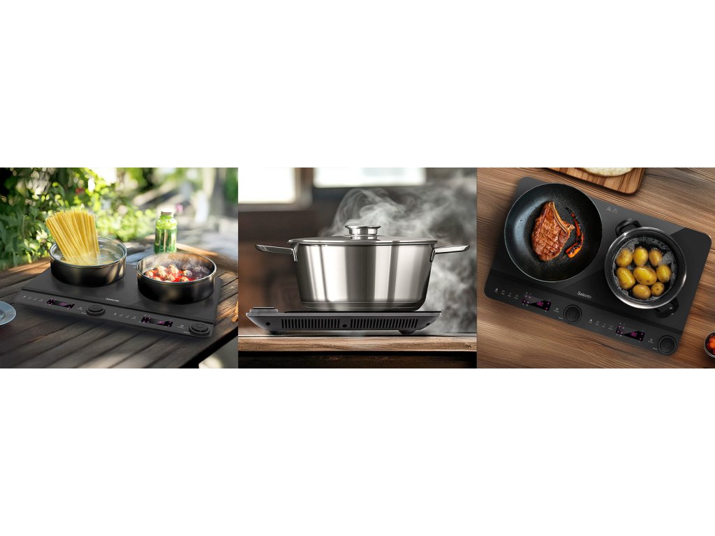 Zabírá minimum místa, ale zvládne uvařit takřka cokoliv. O čem je řeč? Přece o dvouplotýnkovém indukčním vařiči Salente InductPro2, který se pyšní kompaktním a ultratenkým designem (výška jen 4,5 cm), takže se vám bez problému vejde i do malé kuchyňky, na chatu nebo třeba do karavanu. Svoje oblíbená domácí jídla si s ním zkrátka můžete pohodlně připravovat kdekoliv, kde máte k dispozici zásuvku.Když se energie šetrně mění na dokonalou chuť