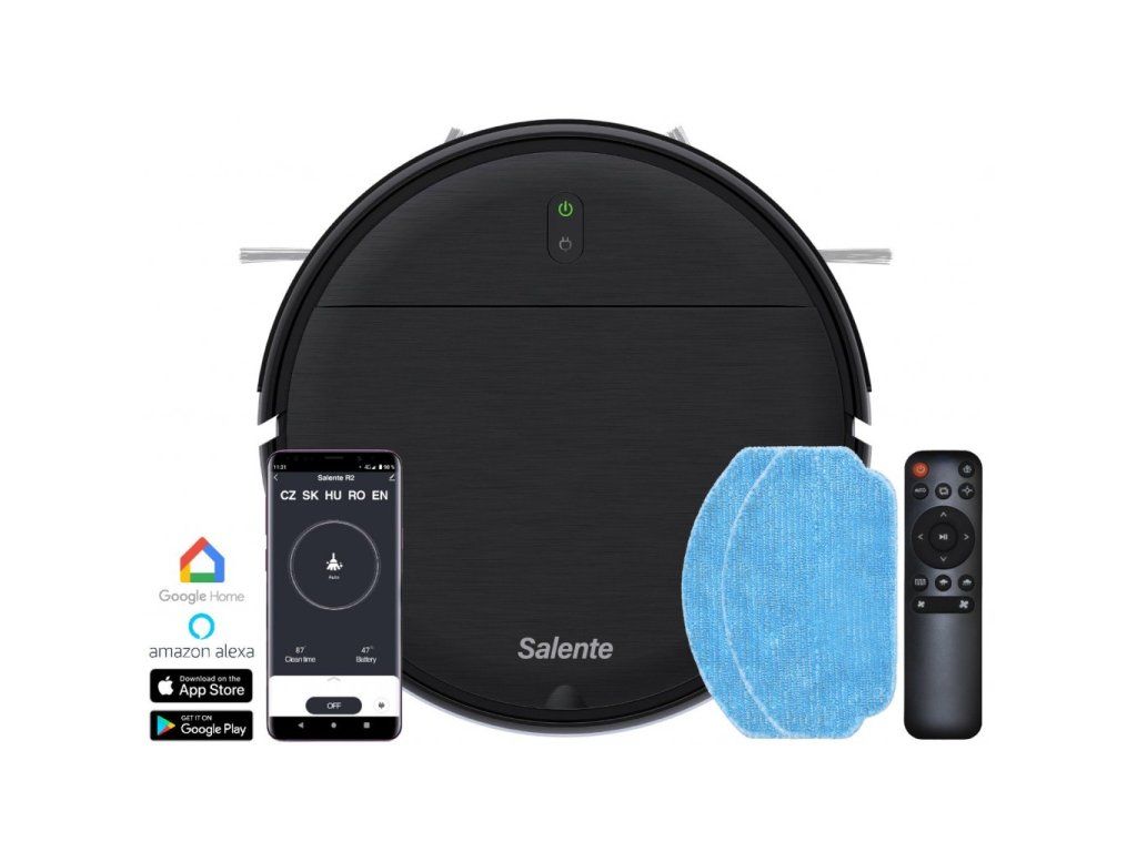 SALENTE R2, robotický vysavač (stírání vodou a nabíjecí stanice) • Vysává a vytírá současně • Mobilní aplikace češtině • Elektronické dávkování vody • Čtyři režimy úklidu • Tichý BLDC motor • Funkce plánovaného úklidu • HEPA filtr • Provoz až 110 minut • Hlučnost méně než 65 dB • Dálkové ovládání • Baterie 2 500 mAh Robotický vysavač 2v1 s mobilní aplikací Vysavač Salente R2 s elektronicky řízeným dávkováním vody vysaje a vytře celý váš byt a ještě se poté sám automaticky nabije. Vysavač můžete ovládat pomocí mobilní aplikace v českém jazyce, nabízí čtyři režimy úklidu a je vybaven kvalitní filtrací s HEPA filtrem. Vysává a vytírá současně Salente R2 je vybaven samostatným zásobníkem na nečistoty a zároveň druhým elektronicky řízeným zásobníkem na vodu. Vysavač tak při jednom průjezdu vysává nečistoty a současně stírá podlahu vlhkým mopem. Tím dosahuje efektivnějšího a rychlejšího úklidu. Vytírání pro všechny typy podlahy Chytrá elektronika zajistí plynulé dávkování vody ve třech různých úrovních a bez nadměrného promáčení podlahy. Volbou vhodné úrovně vytírání můžete Salente R2 použít na všechny druhy podlah včetně dřevěných. Čtyři režimy úklidu Salente R2 nabízí čtyři úklidové režimy, pomocí kterých bude vaše domácnost vždy perfektně uklizena. Můžete využít Automatický úklid, při kterém vysavač inteligentně optimalizuje svou trasu. Nebo můžete využít úklid po obvodu, kdy vysavač pojede podél stěn a pomocí dvojice rotačních kartáčků vymete a vysaje každou nečistotu. Pokud potřebujete uklidit například rozsypanou mouku, můžete použít intenzivní úklid ve spirále.Klikatý pohyb je ideální pro velké místnosti. Mobilní aplikace v českém jazyce Robotický vysavač Salente R2 je možné ovládat mobilní aplikací v českém jazyce. Aplikace umožňuje snadnou obsluhu vysavače, podává informací o aktuální stavu nebo o úrovni nabití baterie. Vysavač podporuje i technologii ovládání hlasem a díky tomu jej můžete ovládat pomocí hlasových povelů. Mobilní aplikace je určena pro operační systémy Android a iOS. Pokud nejste příznivci mobilních technologií nebo nemáte WiFi připojení, můžete vysavač ovládat přiloženým dálkovým ovladačem nebo tlačítky na jeho těle. Uklidí kdykoliv Součástí mobilní aplikace je plánovací kalendář, kde si snadno zvolíte čas, kdy má vysavač začít s úklidem. Můžete tak v klidu odejít do práce nebo za zábavou a po vašem návratu bude vše perfektně uklizeno. Dvoustupňová filtrace s omyvatelným HEPA filtrem Dvoustupňová filtrace s omyvatelným HEPA filtrem pomáhá zachytit jemný prach, alergenní roztoče či zvířecí alergeny. Zabraňuje také úniku drobných částeček prachu zpět do vzduchu. Údržba vysavače je velmi jednoduchá a k jeho provozu nepotřebujete papírové výměnné sáčky. Hepa filtr je omyvatelný a lze ho vyčistit a používat opakovaně. Moderní, tichý a výkonný BLDC motor Osazený výkonný BLDC motor dosahuje dlouhodobé životnosti, vyšší spolehlivosti, tiššího chodu a hlavně úspornějšího provozu oproti klasickým motorům. Vysokokapacitní Li-Ion baterie Vysokokapacitní Li-Ion baterie o kapacitě 2 500 mAh zajistí energii pro úklid na dlouhou dobu. Po skončení úklidu se vysavač automaticky vrátí do nabíjecí stanice, aby byl po dobití opět připraven k dalšímu úklidu. • vysává a vytírá současně • mobilní aplikace v CZ/SK/HU/RO/EN • čtyři režimy úklidu • elektronicky řízené vytírání • plánovaný úklid • dvoustupňová filtrace s HEPA filtrem • ovládání hlasem Alexa / Google Home • dva režimy sacího výkonu • tři úrovně pro mokré vytírání • dvojice antistatických bočních kartáčků • senzory k ochraně vysavače a nábytku • senzory proti pádu ze schodů • režim úklidu automatický, obvodový, spirála, klikatě a ruční • bezsáčkový provoz • automatické nabíjení v nabíjecí stanici • ovládání tlačítkem na těle vysavače • podpora WiFi připojení • aktualizace firmware přes mobilní aplikaci • doba úklidu 110 minut na jedno nabití • tichý provoz, méně než 65 dB • vhodný pro všechny typy tvrdých podlah a nízké koberce • omyvatelný HEPA filtr • moderní a tichý BLDC motor • vysoký sací výkon až 1400 Pa • nádoba na prach, 250 ml • elektronicky řízená nádoba na vodu, 250 ml • vysokokapacitní Li-Ion baterie 2 500 mAh • infračervené dálkové ovládání • průměr 300 mm • výška 74 mm • hmotnost 2,5 kg Obsah balení • Robotický vysavač Salente R2 • zásobník na prach pro vysávání (250 ml) • zásobník na vodu pro mokré mopování (250 ml) • infračervené dálkové ovládání • 2x AAA baterie • dobíjecí základna • 230 V napájecí zdroj • náhradní HEPA filtr • náhradní mopovací tkanina z mikrovlákna • náhradní boční čistící kartáče, 2 ks • čisticí kartáček • uživatelský manuálDodatočné parametre