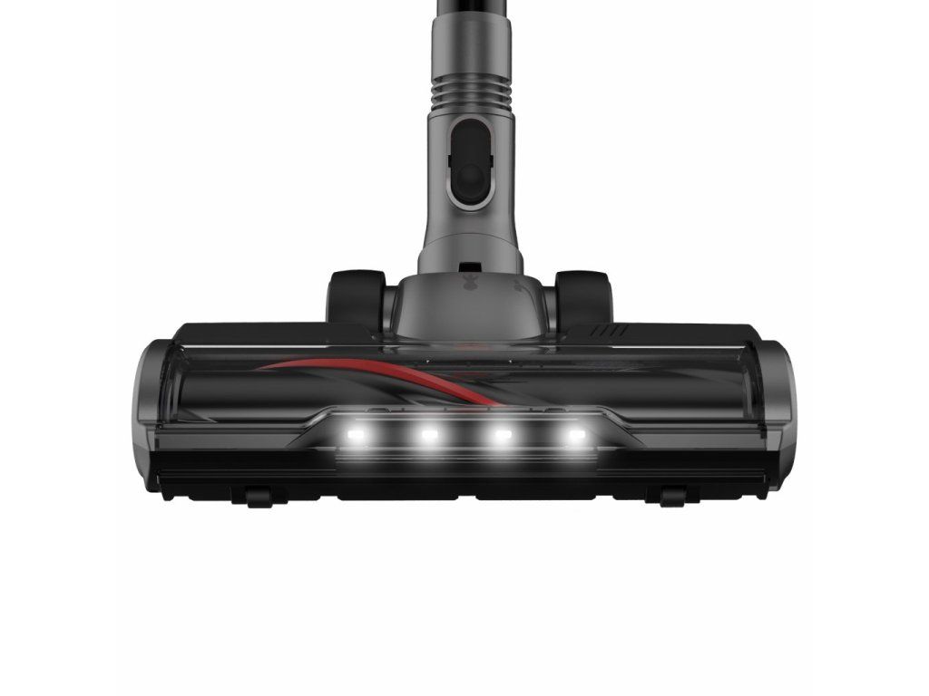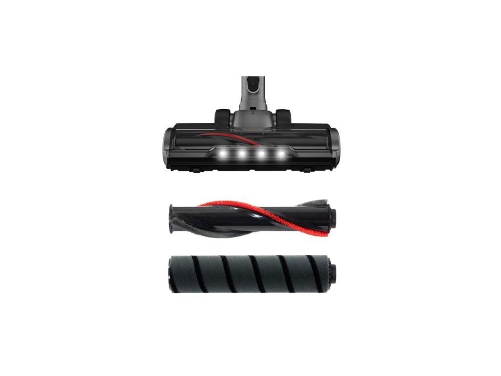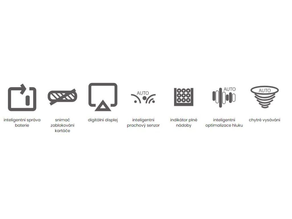 Soustava čidel ve spojení s barevným digitálním displejem informuje uživatele o všem podstatném. Zobrazí stav baterie při vysávání nebo nabíjení, zvolený pracovní režim, potřebu vyprázdnit nádobu na prach nebo zablokovaný rotační kartáč.Vysávací hubice s LED světlem a kartáči pro úklid koberců a tvrdých podlah