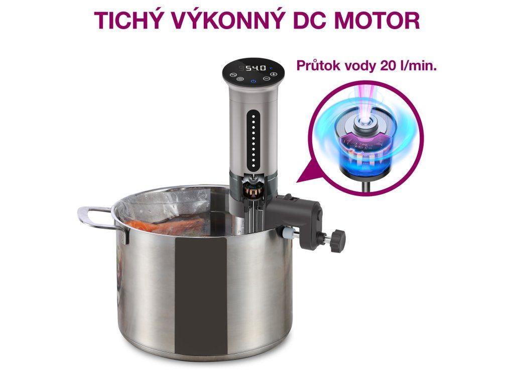 Rovnoměrné prohřátí lázně na nastavenou teplotu pomáhá zajistit špičkový DC motor. Průtok dosahuje hodnoty 20 litrů za minutu, což je dvojnásobně větší hodnota ve srovnání s konkurencí. Další výhodou DC motoru u Sous Vide vařiče Salente SuChef je tichý chod, který je na hranici slyšitelnosti.Nerezové provedení ze špičkového materiálu