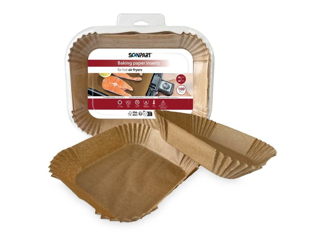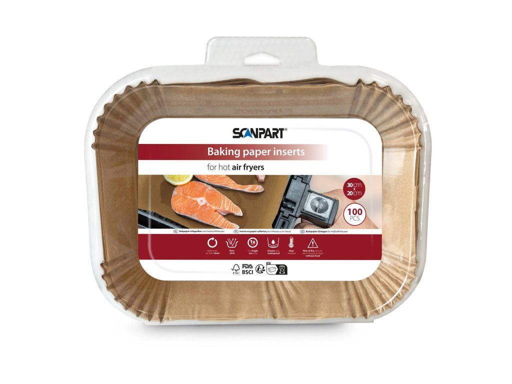 Použitie papiera do teplovzdušnej fritézy pomáha chrániť povrch koša a zjednodušuje údržbu spotrebiča. Varianta 30 × 20 cm je ideálna pre fritézy s väčším objemom (cca 5–8 l), pretože umožňuje rovnomerné rozloženie potravín a lepšie výsledky pri pečení.