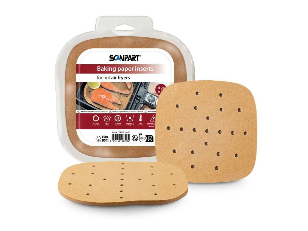 Praktické a hygienické riešenie na každodenné varenie v teplovzdušnej fritéze. Perforovaný papier do teplovzdušnej fritézy ScanPart je navrhnutý tak, aby zachoval maximálne prúdenie horúceho vzduchu a zároveň chránil vnútro spotrebiča pred mastnotou a nečistotami. Vďaka tomu dosiahnete rovnomerne prepečené a chrumkavé výsledky bez zbytočného čistenia.