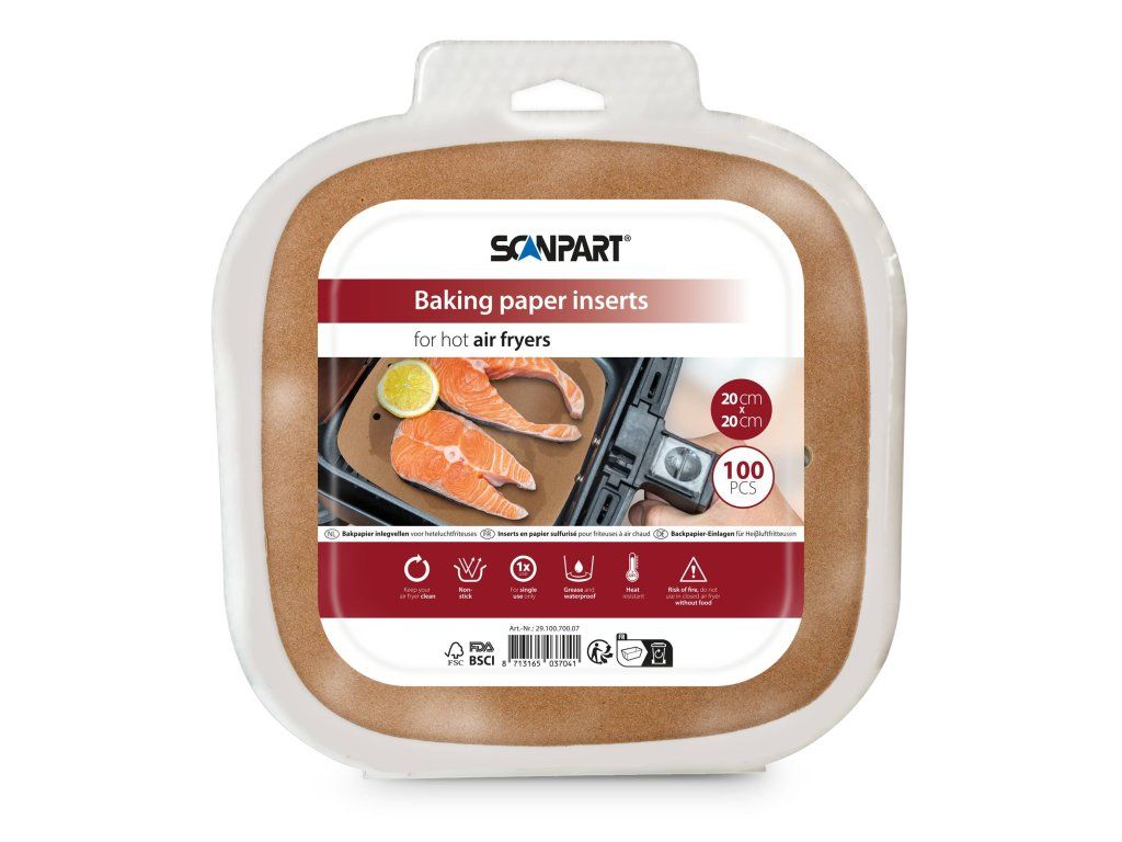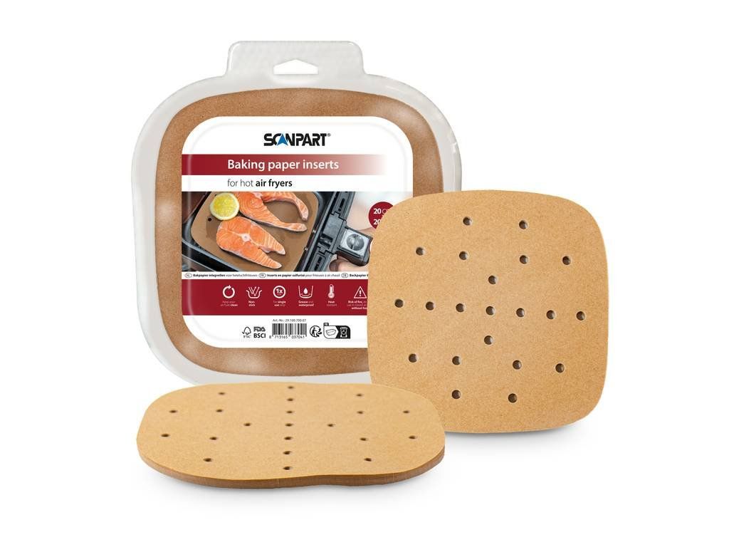 Praktické a hygienické riešenie na každodenné varenie v teplovzdušnej fritéze. Varianta s rozmerom 20 × 20 cm je ideálna pre väčšie koše fritéz a prípravu väčších porcií jedál. Perforovaný papier do teplovzdušnej fritézy ScanPart je navrhnutý tak, aby zachoval optimálne prúdenie horúceho vzduchu a zároveň chránil vnútro spotrebiča pred mastnotou a nečistotami.