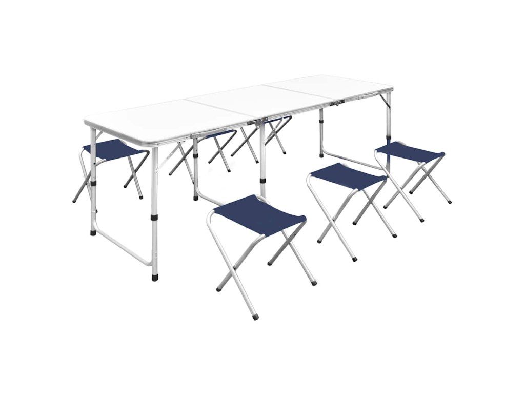Tento skladací kempingový set pozostáva z 1 skladacieho stola a 6 skladacích stoličiek. Vďaka praktickej rúčke na prenášanie a stolíku s nastaviteľnou výškou je tento set ako stvorený do kuchyne, na terasu či do záhrady a môžete si ho so sebou zobrať aj na pikniky a stanovačky.