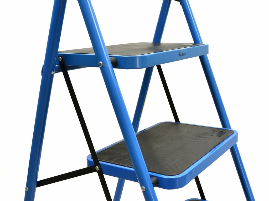 Skládací třístupňpové schůdky jsou vybaveny protiskluzovými nášlapy, pro bezpečné používání. Mají měkčené madlo, konstrukci z práškově lakované oceli, jejich součástí je také bezpečnostní zámek proti náhodnému sklopení. Plastové koncovky na nohách žebříku pak zabraňují poškrábaní podlahy. Schůdky lze jednoduše složit pro snadnou přepravu, manipulaci a skladování.Technické parametry: