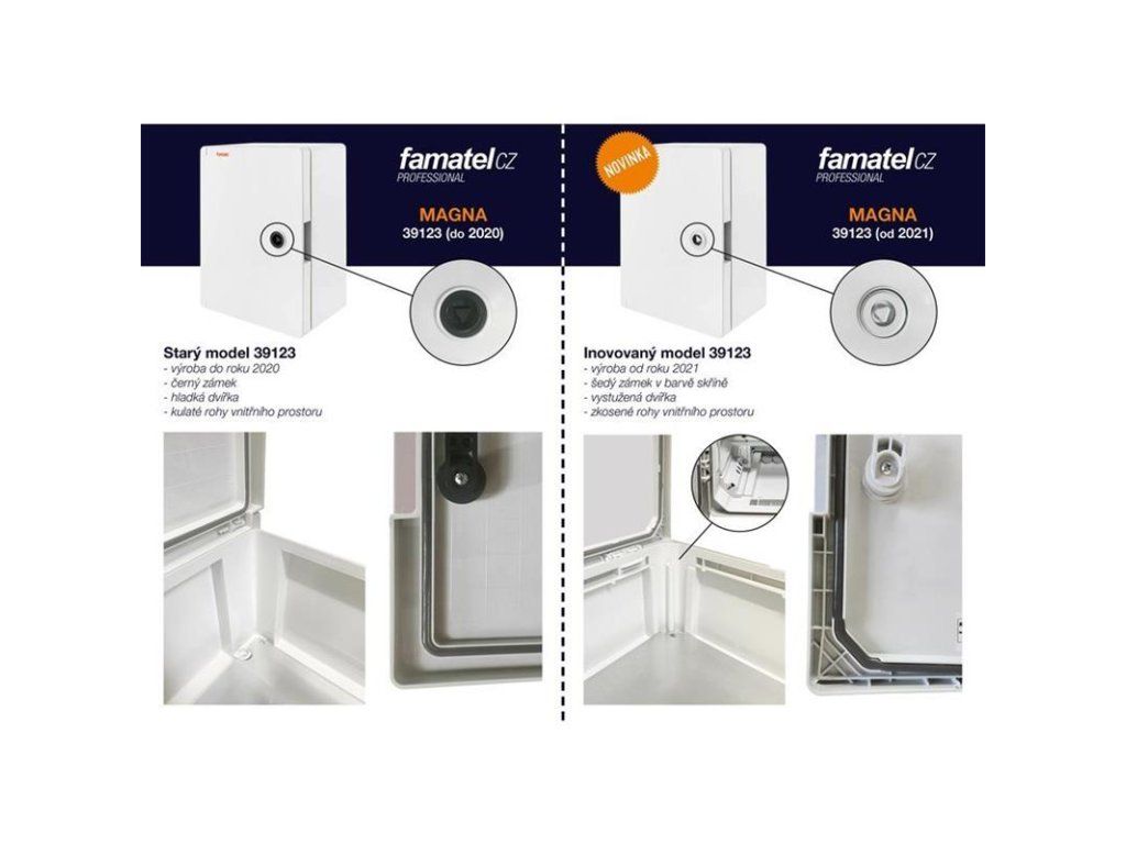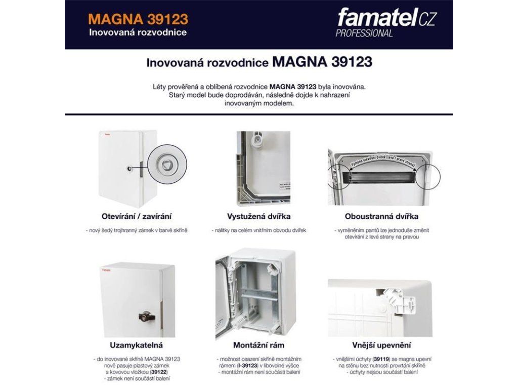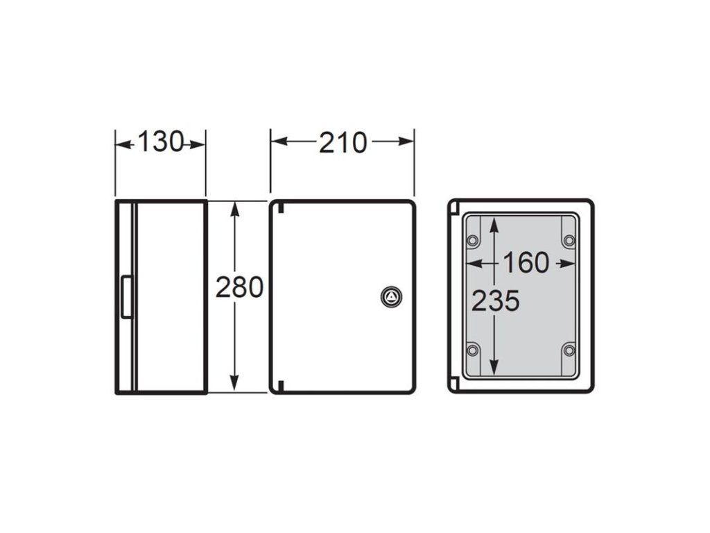 Univerzální rozvodná plastová skříň MAGNA 39123 ve vyšším krytí IP65, rozměry: 280x210x130mm, součástí skříně je pozinkovaná montážní deska, neprůhledné plné dveře, barva: světle šedá. Univerzální rozvodná plastová skříň MAGNA 39123 ve vyšším krytí IP65, rozměry: 280x210x130mm (výška x šířka x hloubka), max. vnitřní rozměry (po osazení mont. desky): 235x160x87mm (výška x šířka x hloubka), IK08, plastová, materiál ABS, zkouška žhavou smyčkou 650°C, bezhalogenová a UV odolná, montáž na povrch, barva: světle šedá, rozsah teplot -25°C + 85°C, aplikované normy: EN 62208, balení: 1ks (krabice), součástí balení je pozinkovaná montážní deska, plné dveře - otevírání plastovým trojhranem, možnost změnit směr otevírání dveří, hladké boky, schopnost rozptylu tepla: 19W, dokoupitelné příslušenství: kovový zámek 39122, ocelový montážní rám s DIN lištou a modulovým krytem (1x7mod.) I-39123, polyesterová montážní deska PL-39123, tyto univerzální skříně MAGNA IP65 se hodí do vlhkého prostředí a do prostředí, kde klasické kovové skříně rychle korodují. Pro montáž na hořlavé podklady je nutné použít nehořlavou podložku.Dodatočné parametre