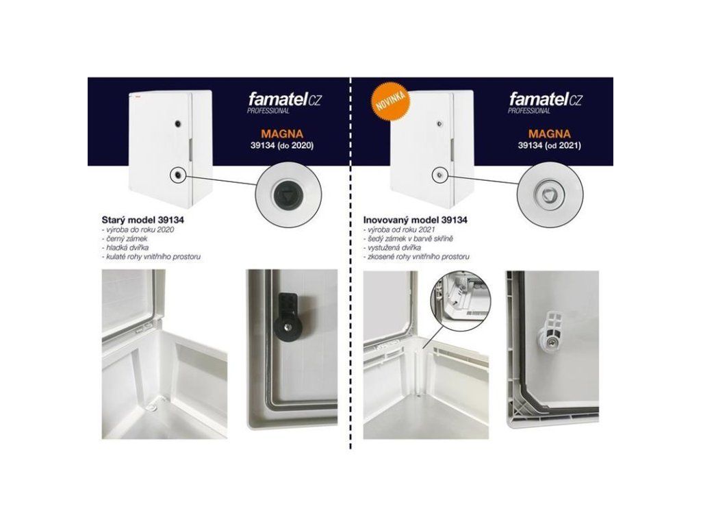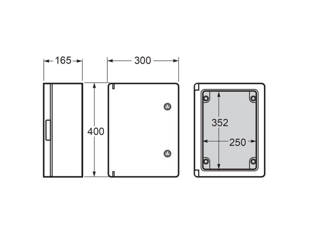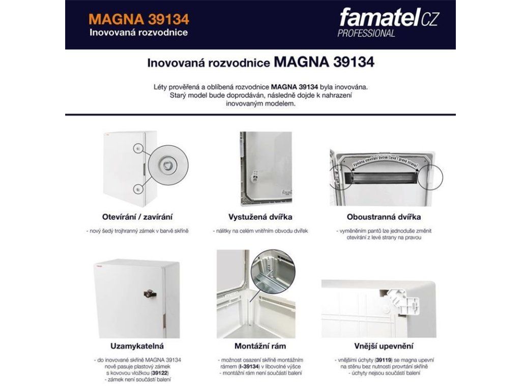 Univerzální rozvodná plastová skříň MAGNA 39134 ve vyšším krytí IP65, rozměry: 400x300x165mm, součástí skříně je pozinkovaná montážní deska, neprůhledné plné dveře, barva: světle šedá. Univerzální rozvodná plastová skříň MAGNA 39134 ve vyšším krytí IP65, rozměry: 400x300x165mm (výška x šířka x hloubka), max. vnitřní rozměry (po osazení mont. desky): 352x250x120mm (výška x šířka x hloubka), IK08, plastová, materiál ABS, zkouška žhavou smyčkou 650°C, bezhalogenová a UV odolná, montáž na povrch, barva: světle šedá, rozsah teplot -25°C + 85°C, aplikované normy: EN 62208, balení: 1ks (krabice), součástí balení je pozinkovaná montážní deska, plné dveře - otevírání plastovým trojhranem, možnost změnit směr otevírání dveří, hladké boky, schopnost rozptylu tepla: 34W, dokoupitelné příslušenství: kovový zámek 39122, ocelový montážní rám s DIN lištou a modulovým krytem (2x11mod.) I-39134, polyesterová montážní deska PL-39134, tyto univerzální skříně MAGNA IP65 se hodí do vlhkého prostředí a do prostředí, kde klasické kovové skříně rychle korodují. Pro montáž na hořlavé podklady je nutné použít nehořlavou podložku.Dodatočné parametre