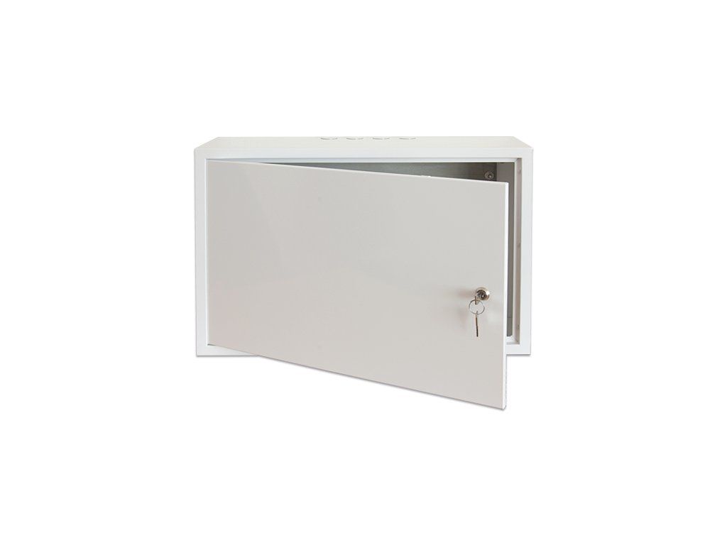 Montážní ochranná skříň uzamykatelná s odjímatelnou plechovou plotnou na zadní straně. Skříň je vyrobena z pozinkovaného materiálu proti zrezivění s povrchovou úpravou bílé barvy. Po odstranění krytek získáme otvory pro kabeláž na horní a spodní straně.| Rozměry: | |