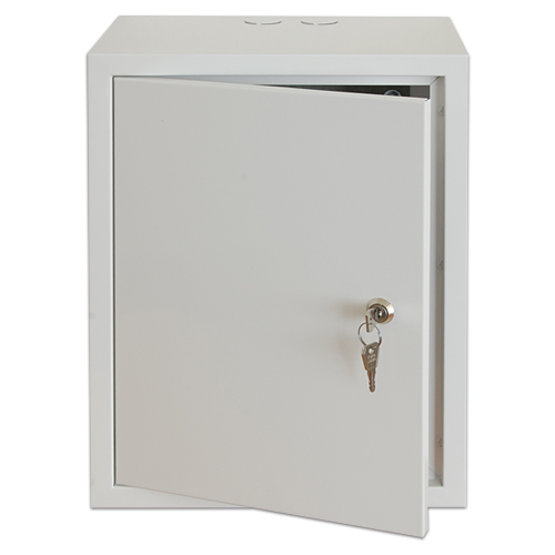 Montážní ochranná skříň uzamykatelná s odjímatelnou plechovou plotnou na zadní straně. Skříň je vyrobena z pozinkovaného materiálu proti zrezivění s povrchovou úpravou bílé barvy. Po odstranění krytek získáme otvory pro kabeláž na horní a spodní straně.| Rozměry: | |