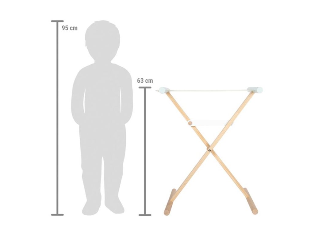 Na tomto dřevěném sušáku na prádlo je snadné usušit veškeré oblečení pro panenky, medvídky a jejich kamarády. Tento sušák prádla, který se snadno sestavuje, obsahuje pět bavlněných šňůr ve výšce vhodné pro děti. Je ideální hračkou na hraní rolí, která napodobuje rodiče při jejich domácích pracích a zábavnou formou přivádí děti k nadšení pro každodenní úkoly. Dodává se s bezpečnostní tyčí pro stabilní postavení. Je to skvělý doplněk do domečku pro panenky, který působí vizuálně skvělým dojmem díky množství přírodního dřevěného materiálu a jemné barvě přírodního dřeva. Prádlo je suché! Po dokončení hry lze sušák na prádlo snadno složit a uložit tak, aby šetřil místo. Tato hračka je vhodná do každého domečku pro panenky. Hlavní vlastnosti: 5 ks textilních šňůrbezpečnostní tyč pro stabilní postavenípodporuje kreativituDodatočné parametre