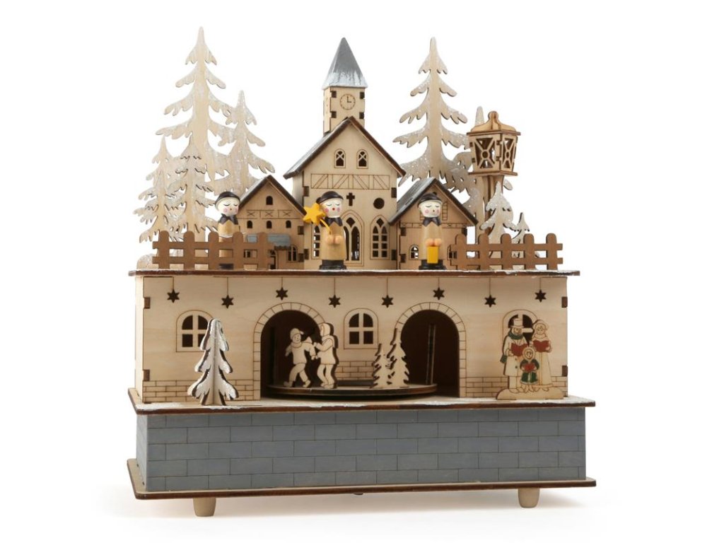 Vykouzlete si nejen vánoční atmosféru při pohledu na tančící postavičky v kouzelné vesnici. Při natažení hraje známá melodie a pod zasněženou osvětlenou krajinou tančí postavičky. Skříňka je dodávána ve složeném stavu. Osvětlení zajišťují LED zdroje světla s nízkou spotřebou energie, které napájí dvojice AA baterií (nejsou součástí balení). Hlavní vlastnosti: pohyblivé detailyvánoční melodieLED osvětlení (2×AA baterie nejsou součástí balení)Dodatočné parametre