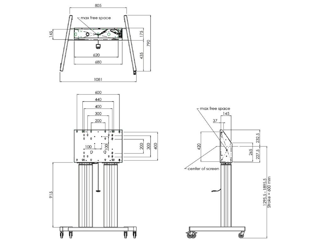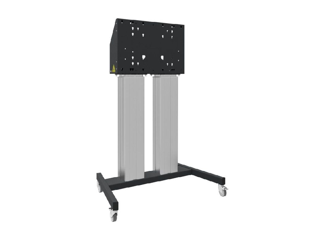 Motorizovaný pojízdný zdvih největších displejů Stojan s elektrickým zdvihem využijete především v oblasti vzdělávání, digitální tvorby nebo produktového a firemního marketingu. Model 062.7105 nabízí snadnou změnu výšky stojanu až o 600 mm, takže střed obrazovky se může pohybovat v rozpětí 1 295,5 – 1 895,5 mm. Snadná montáž v několika základních krocích Držák je osazen uchycením VESA až do 600 x 400 mm, pro případ montáže větších displejů je přibalen i adaptér zvyšující VESA až na 800 x 600 mm, takže bude vyhovovat i těm největším obrazovkám. V kabinetu za displejem je prostor pro umístění PC, přehrávače, tenkého klienta apod. Pro montáž těchto malých zařízení je stojan vybaven i rozhraním VESA 75/100 a možností uzamčení s pomocí dokoupitelného krytu. Stabilita a bezpečnost celého systému Stojan je vhodný i do prostor se zvýšeným pohybem osob a k montáži dotykových výukových displejů. Systém stojanu, displeje a přídavné elektroniky je umístěn na podstavci s kolečky, který nebrání přístupu až k displeji. Volitelné příslušenství (viz níže) vám umožní vše nakonfigurovat přesně podle vašich potřeb. Drátový dálkový ovladač je vhodné připevnit přímo k displeji, čímž získáte plnou kontrolu nad pohybem displeje. Klíčové vlastnostiŘešení pro každé přání Rozšiřující příslušenství umožňuje komplexní využití stojanu na míru vašim potřebám.