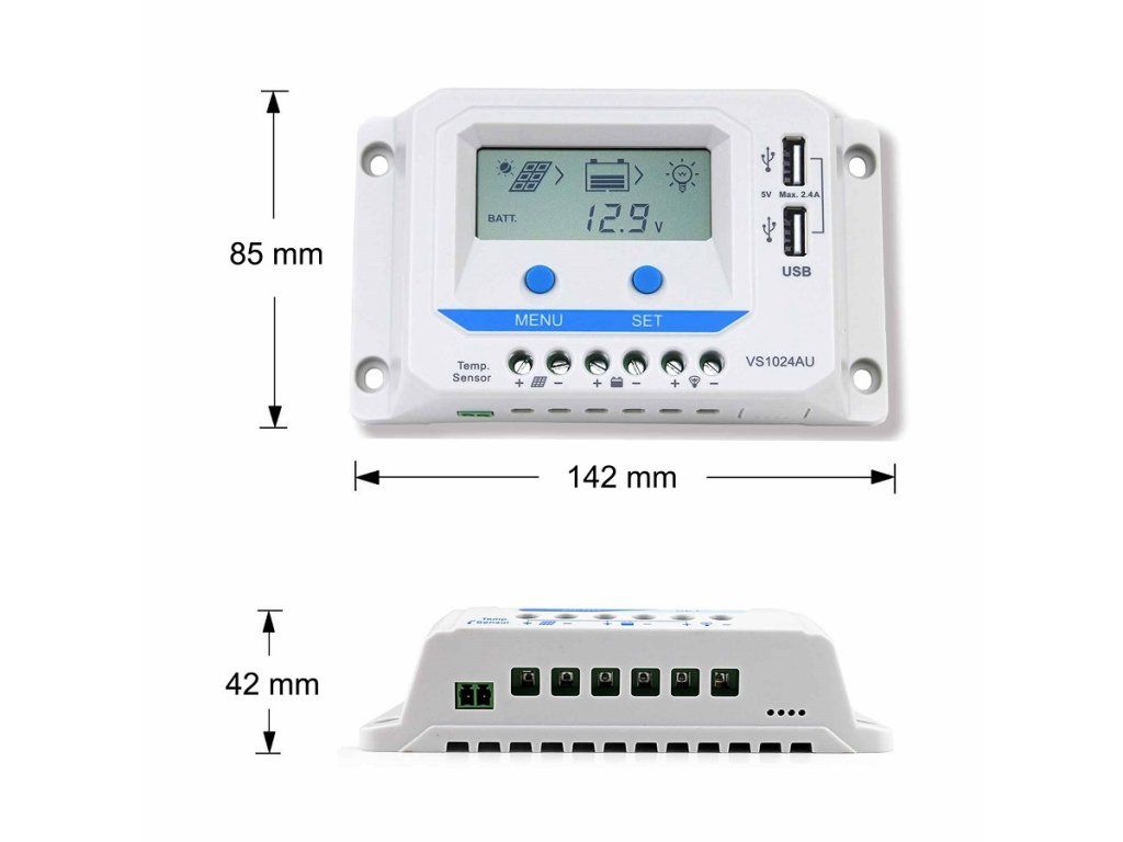 PWM solární regulátor. Svou konstrukcí je určen pro malé ostrovní solární systémy se solárními panely 12V (36 článků) pro dobíjení 12V baterie, nebo solárními panely 24V (72 článků – možno zapojit dva 36 článkové panely do série) pro dobíjení 24V baterie a maximálním nabíjecím proudem do 10A. Výhodou je velmi jednoduchá a nenáročná instalace a spolehlivý provoz.