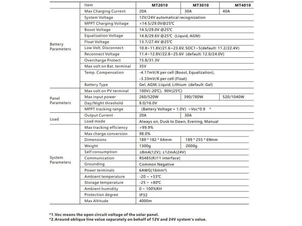 • Maximálny výkon fotovoltického panelu: 520 W (12V) alebo 10400 W (24V) pre maximálne využitie regulátora. Ak sa použije výkonnejší panel, plný výkon sa nevyužije, ale funkcia regulátora zostane zachovaná bez poškodenia.
