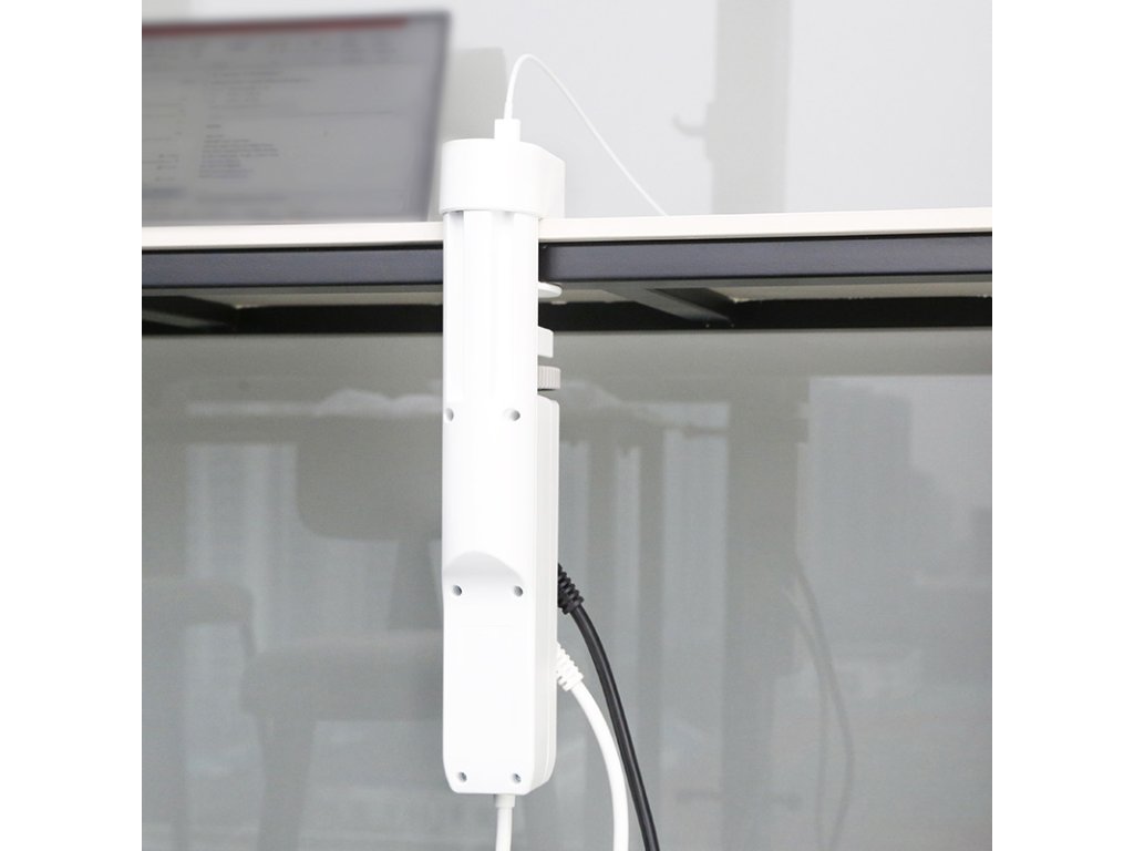 Zásuvku lze upevnění na stůl či pracovní desku pomocí velké otočné matice, bez nutnosti vrtání. Zásuvky 230V jsou schované pod stolem, USB nabíječka a centrální vypínač přístupné shora. Možnost upevnění i v opačném směru, 230V zásuvky nad stolem a USB pod stolem.