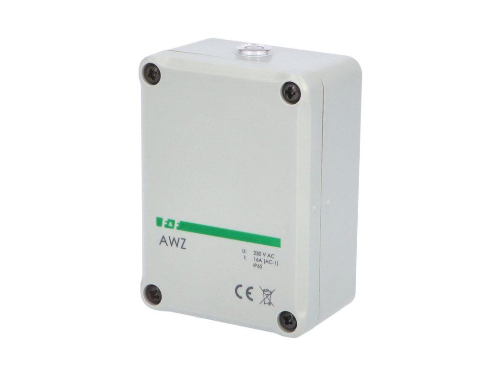 Spínač soumrakový F&F AWZ - rozsah nastavení 2-1000lux, jmenovitý proud 16A, jmenovité napětí 230V, krytí IP65, montáž na povrch. Soumrakový spínač AWZ slouží k automatickému zapínání osvětlení ulic, vitrín obchodů, náměstí atd. za soumraku a vypínání tohoto osvětlení za svítání. Soumrakový spínač má možnost nastavení intenzity osvětlení v rozsahu 2 až 1000 Lux. Pokud dosáhne požadované úrovně zapnutí, čidlo se aktivuje za 5 sekund. Důvodem pro zpoždění je to, aby se zabránilo zapínání a vypínání při náhlých změnách osvětlení (světla aut, blesky atd.). Napájecí napětí 230 V 50-60Hz, max. spínaný proud je 16 A. Soumrakové čidlo je vhodné pro montáž na omítku.