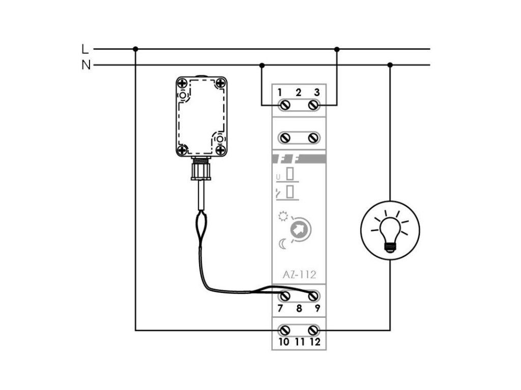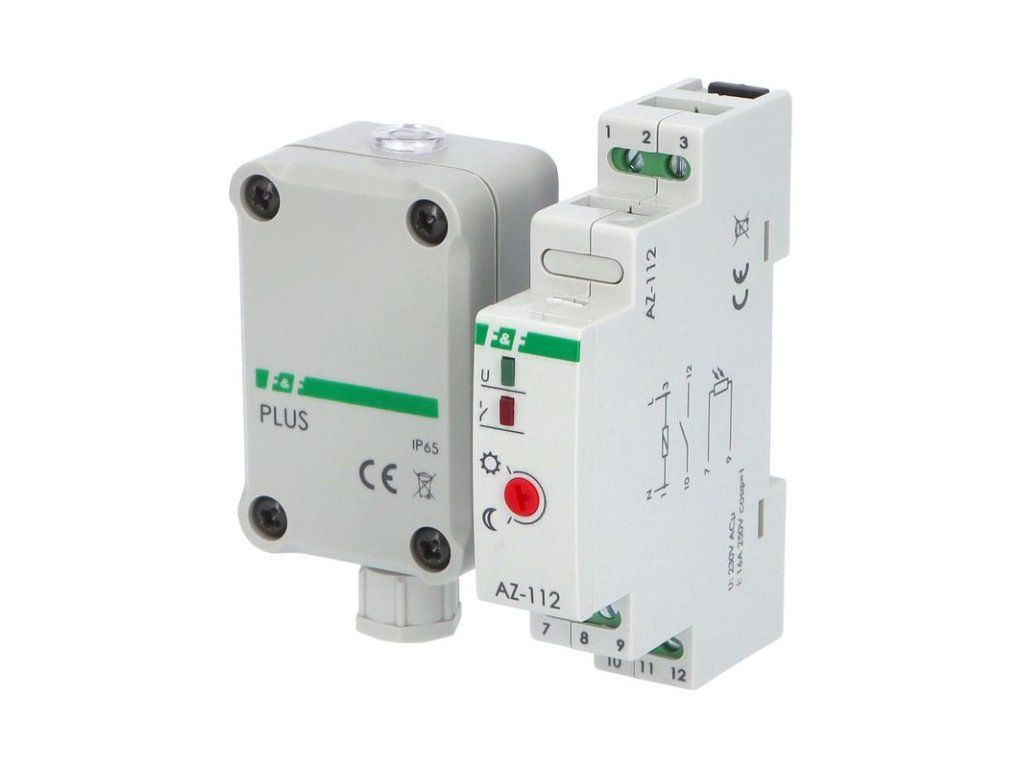 Spínač soumrakový F&F AZ-112 PLUS - rozsah nastavení 2-1000lux, jmenovitý proud 16A, jmenovité napětí 230V, s externím čidlem (montáž na stěnu), krytí IP65, barva šedá, montáž na nosnou lištu. Soumrakový spínač AZ-112 PLUS slouží k automatickému zapínání osvětlení ulic, vitrín obchodů, náměstí atd. za soumraku a vypínání tohoto osvětlení za svítání. Soumrakový spínač má možnost nastavení intenzity osvětlení v rozsahu 2 až 1000 Lux. Pokud dosáhne požadované úrovně zapnutí, čidlo se aktivuje za 10 sekund. Pokud dosáhne požadované úrovně vypnutí, čidlo se deaktivuje za 20 sekund. Důvodem pro zpoždění je to, aby se zabránilo zapínání a vypínání při náhlých změnách osvětlení (světla aut, blesky atd.). Napájecí napětí 230 V 50-60Hz, max. spínaný proud je 16 A. Řídící jednotka je vhodná pro montáž na nosnou DIN lištu do rozváděče, externí čidlo je vhodné pro montáž na povrch.Dodatočné parametre