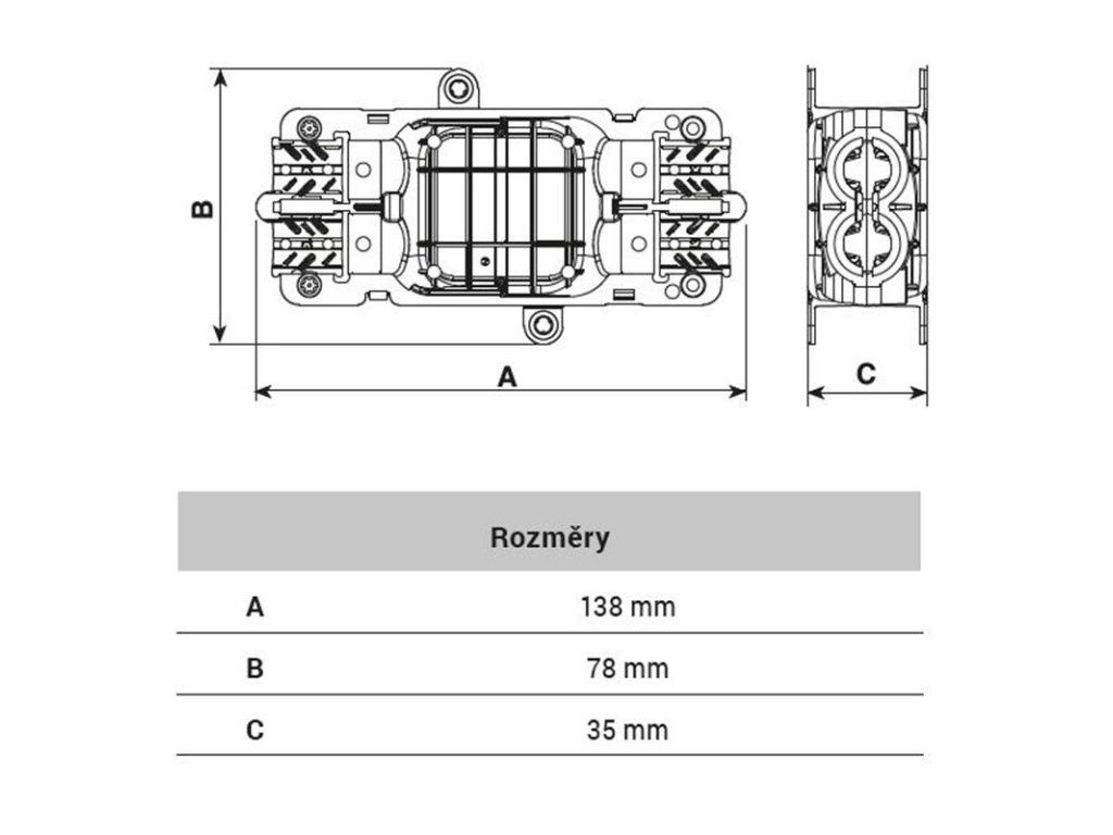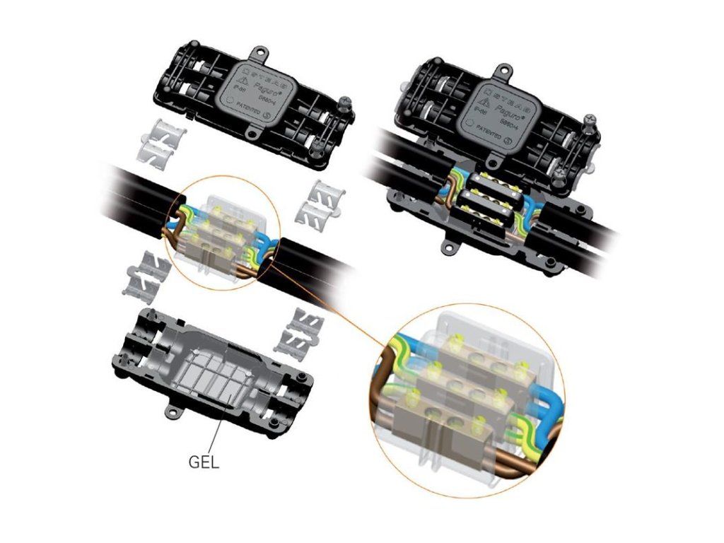 Spojka gelová PAGURO 5660/4/2 IP68, se svorkou 3x6mm2. Vnější průměr kabelu (min. - max.) 7,5 - 16 mm. Odbočné spojení, 450V/25A, rozměry: 138 x 78 x 35 mm. Profesionální řešení elektrického spoje s vysokou odolností vůči podzemní vodě, vzlínající vlhkosti skrz vodiče společně v kombinaci s perfektní mechanickou odolností zaručuje dlouhou a hlavně bezúdržbovou životnost.Spojky jsou předvyplněny speciálním gelem, který má stejné vlastnosti po celou dobu životnosti elektrického spoje (bez data expirace). Součástí plastové spojky z materiálu NYLON 66 RV-AE jsou vždy šroubové svorky (s plíškem vhodným mj. i pro laněné vodiče) a vymezovací podložky pro PVC i gumové kabely. Patentovaný systém provedení spojky PAGURO je navrhnutý pro elektrické spoje svítidel a dalších spotřebičů, jenž musí odolávat vystaveným přírodním vlivům po dlouhá léta. Excelentní elektrická izolace spoje - to je PAGURO!