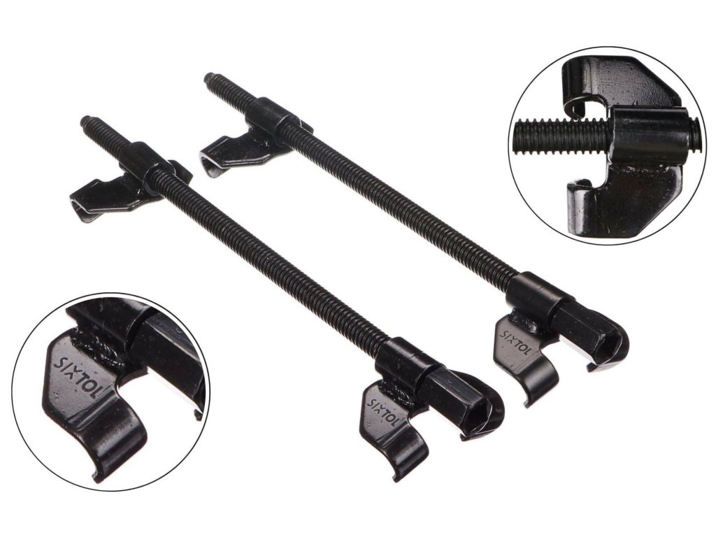 Sada dvou stahováků pružin SIXTOL o délce 270 mm z robustní oceli. Stahováky jsou vhodné pro všechny běžné typy pružin včetně sloupcových, MacPherson a nezávislých pružin. Na koncích jsou osazeny čtyřhranem pro ráčnu o velikosti 1/2" a práci s pružinou při zatížení usnadňují jemné závity. Bezpečnost práce je zaručena speciálně tvarovanými dvouramennými úchyty.Obsah sady: