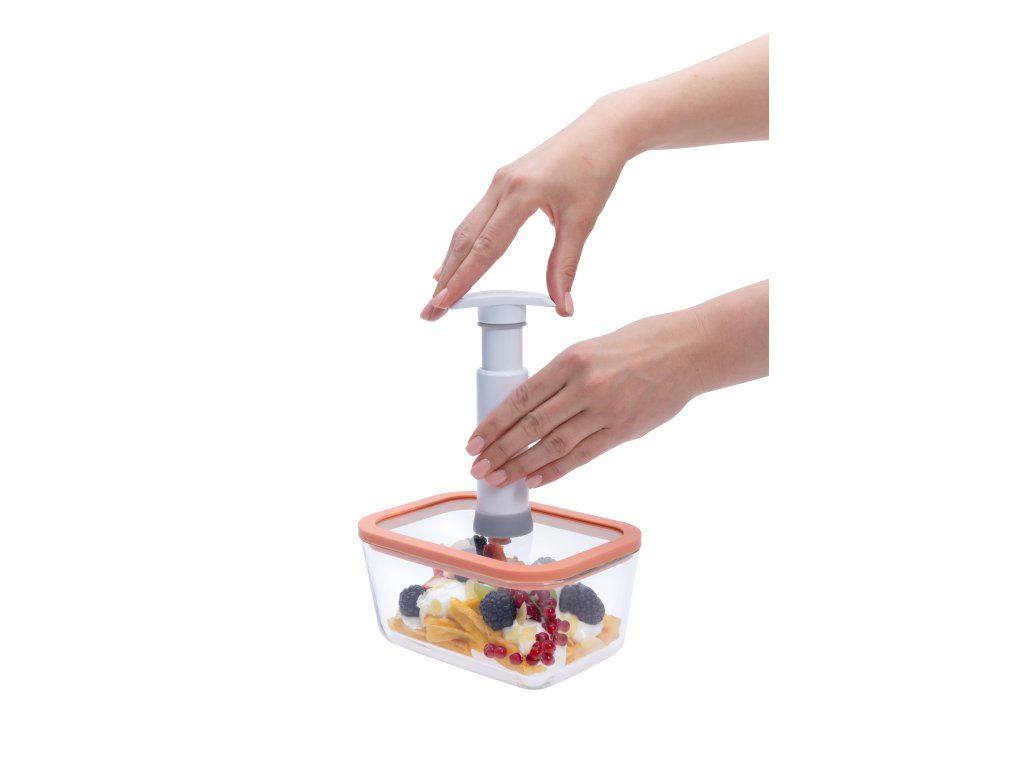Materiál: Dóza je vyrobená z pevného a odolného borosilikátového skla, veko je vyrobené z tvrdeného skla so silikónovým tesnením. Ventil je zo silikónu, vákuovacia pumpa je z ABS plastu a silikónu. Všetky materiály sú bezpečné pre potraviny.