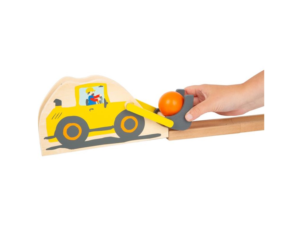 Zábava s loptou pre najmenších! Diely tejto guľôčkovej dráhy sa dajú ľahko zostaviť, takže veľká farebná guľa môže začať svoj pretek naozaj rýchlo! Deti, ktoré s motorickými aktivitami ešte len začínajú, si túto nápaditú hru určite užijú. Vďaka prvkom staveniska sa deti zábavnou formou naučia o príčine a následku, precvičia si aj pozorovanie pri sledovaní pohybujúcich sa predmetov. Dráha je vyrobená z prírodného dreva s farebnými prvkami staveniska. Jednoduchý dizajn nezaťažuje detské zmysly, diely sú dostatočne veľké, takže ich deti nemôžu len tak prehltnúť. Diely sú pre deti ľahko uchopiteľné. Vďaka modulárnej konštrukcii si deti môžu postaviť mnoho rôznych typov dráh, nič neobmedzuje ich fantáziu. Je kompatibilná aj s ihriskom s guľôčkovými dráhami LE11379. Staršie deti môžu na dráhu namiesto loptičiek púšťať autíčka. Hlavné vlastnosti 10 kusov dráhy5 stavebných prvkov3 loptičky1 bager1 sklápačKompatibilné s LE11379Dodatočné parametre