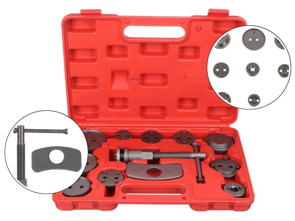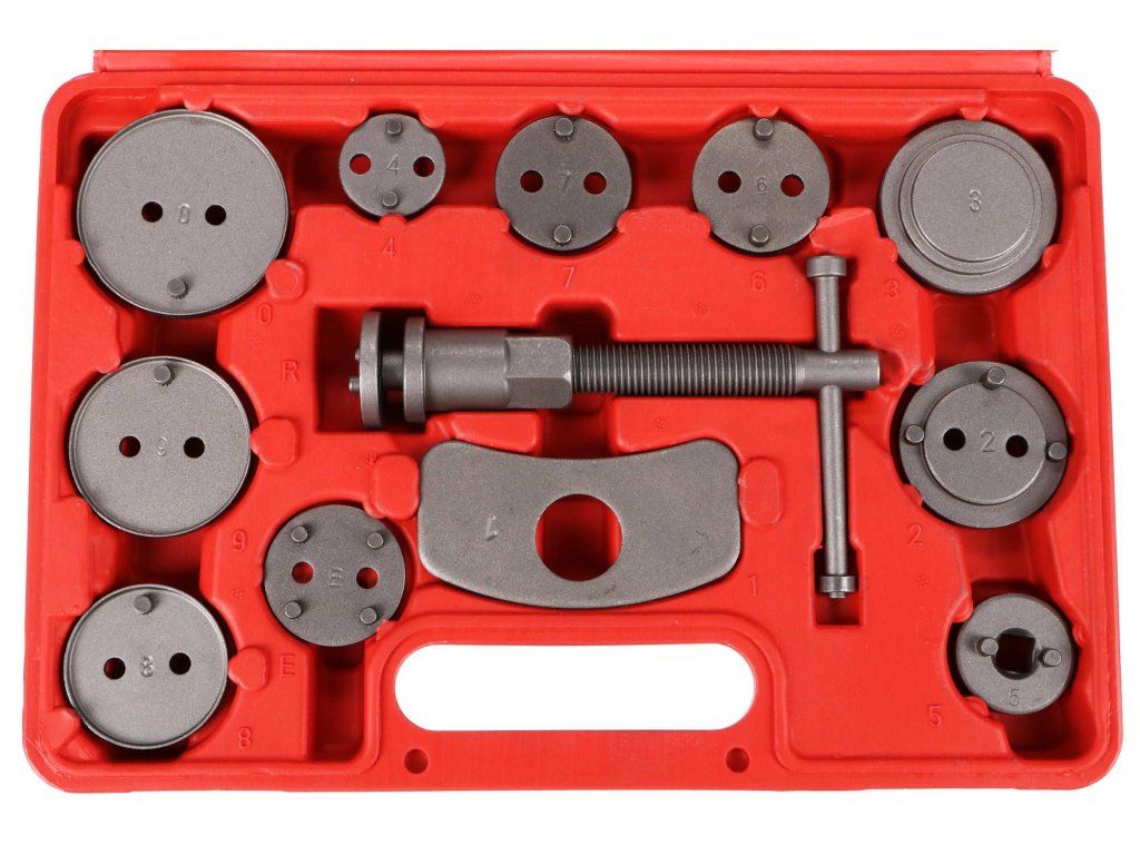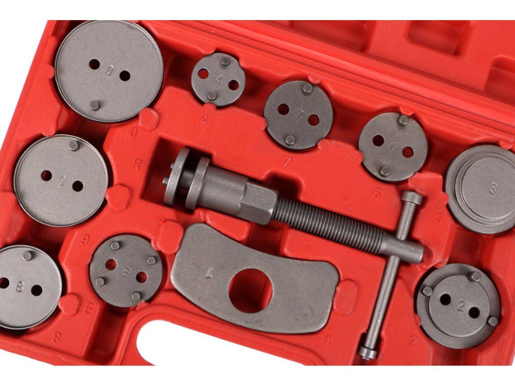 Univerzální sada stlačováků brzdových pístů BRAKE SET s 12 díly v plastovém kufru vhodná k montáži/zpětnému vracení pístů/třmenů kotoučových brzd. Sada obsahuje stlačovací pravotočivou závitnici s magnetem, doraz a 10 různých adaptérů. U vozidel s třmeny kotoučových brzd a s integrovanou jednotkou ruční brzdy se zpětné vracení brzdových pístů provádí zpětným otáčením, u ostatních vozidel zpětným stlačením těchto pístů.Obsah sady: