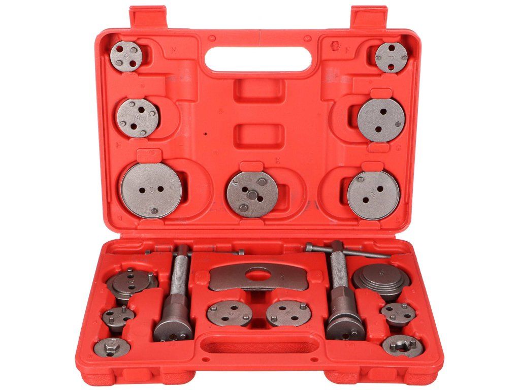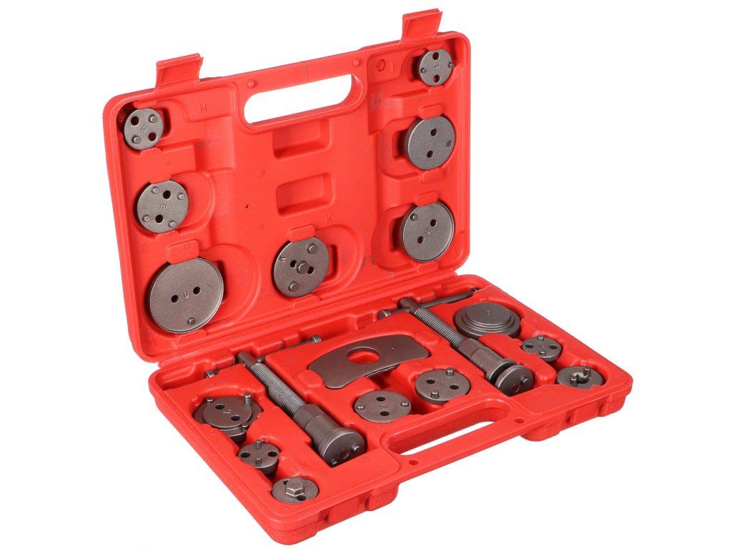 Univerzální sada stlačováků brzdových pístů BRAKE SET s 18 díly v plastovém kufru vhodná k montáži/zpětnému vracení pístů/třmenů kotoučových brzd. Sada obsahuje pravotočivou i levotočivou stlačovací závitnici s magnetem, doraz a 15 různých adaptérů. U vozidel s třmeny kotoučových brzd a s integrovanou jednotkou ruční brzdy se zpětné vracení brzdových pístů provádí zpětným otáčením, u ostatních vozidel zpětným stlačením těchto pístů.Obsah sady: