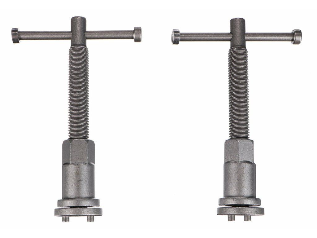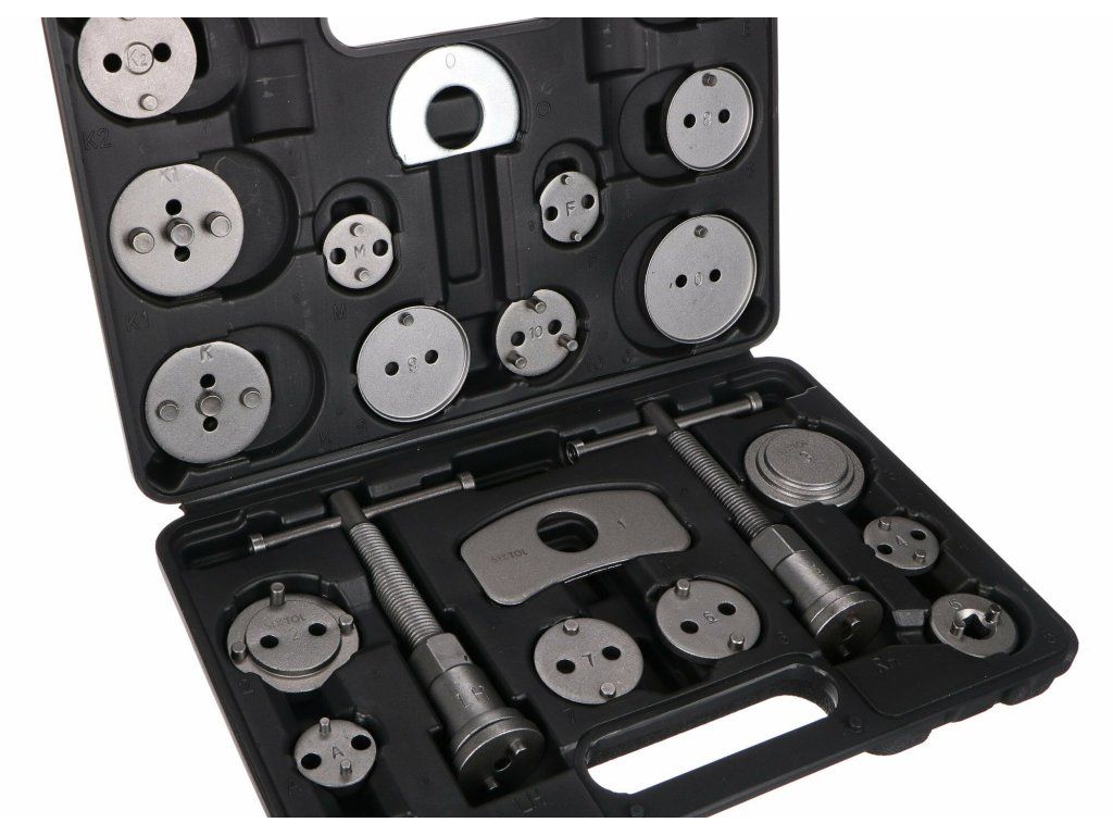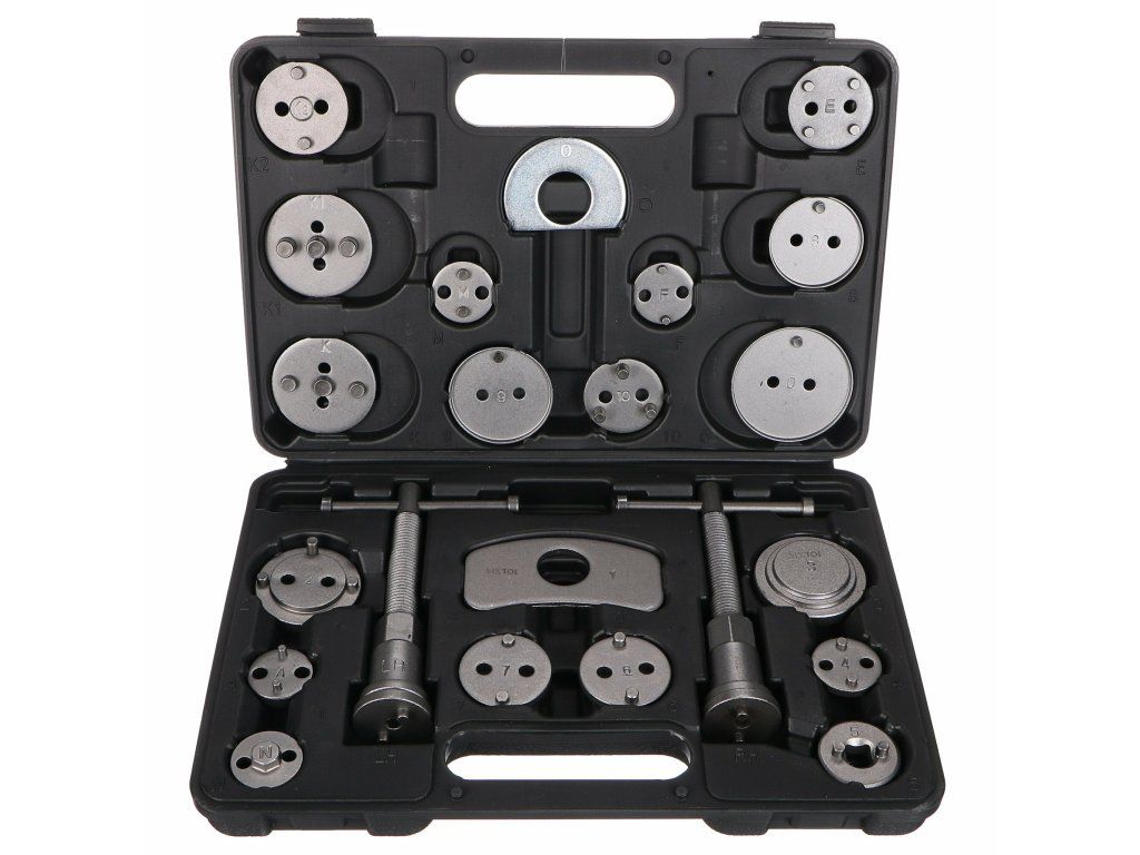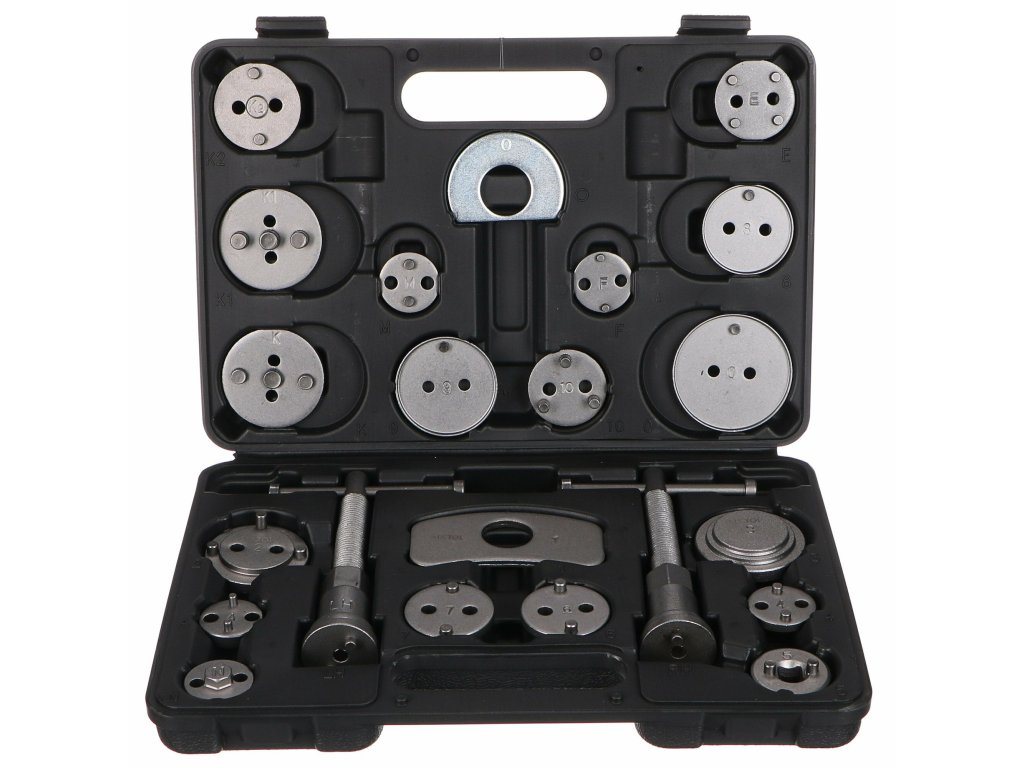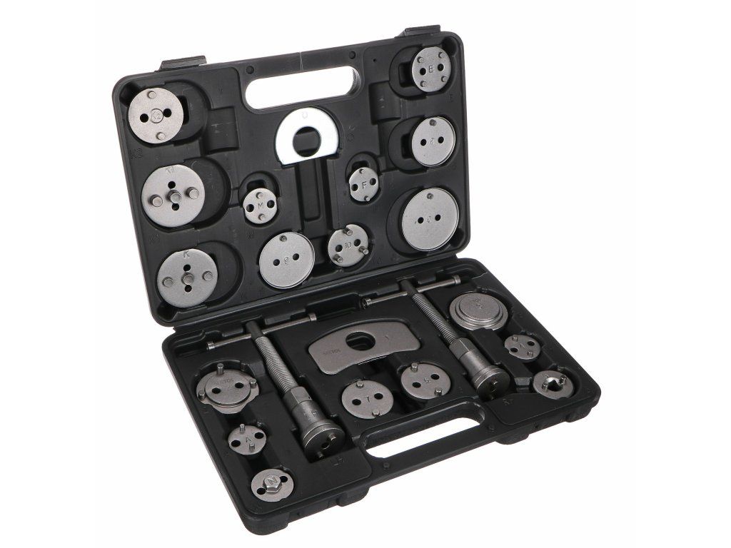 Univerzální sada stlačováků brzdových pístů BRAKE SET BLACK s 22 díly v černém plastovém kufru vhodná k montáži/zpětnému vracení pístů/třmenů kotoučových brzd. Sada obsahuje pravotočivou i levotočivou stlačovací závitnici s magnetem, dva dorazy a 18 různých adaptérů. U vozidel s třmeny kotoučových brzd a s integrovanou jednotkou ruční brzdy se zpětné vracení brzdových pístů provádí zpětným otáčením, u ostatních vozidel zpětným stlačením těchto pístů.Obsah sady: