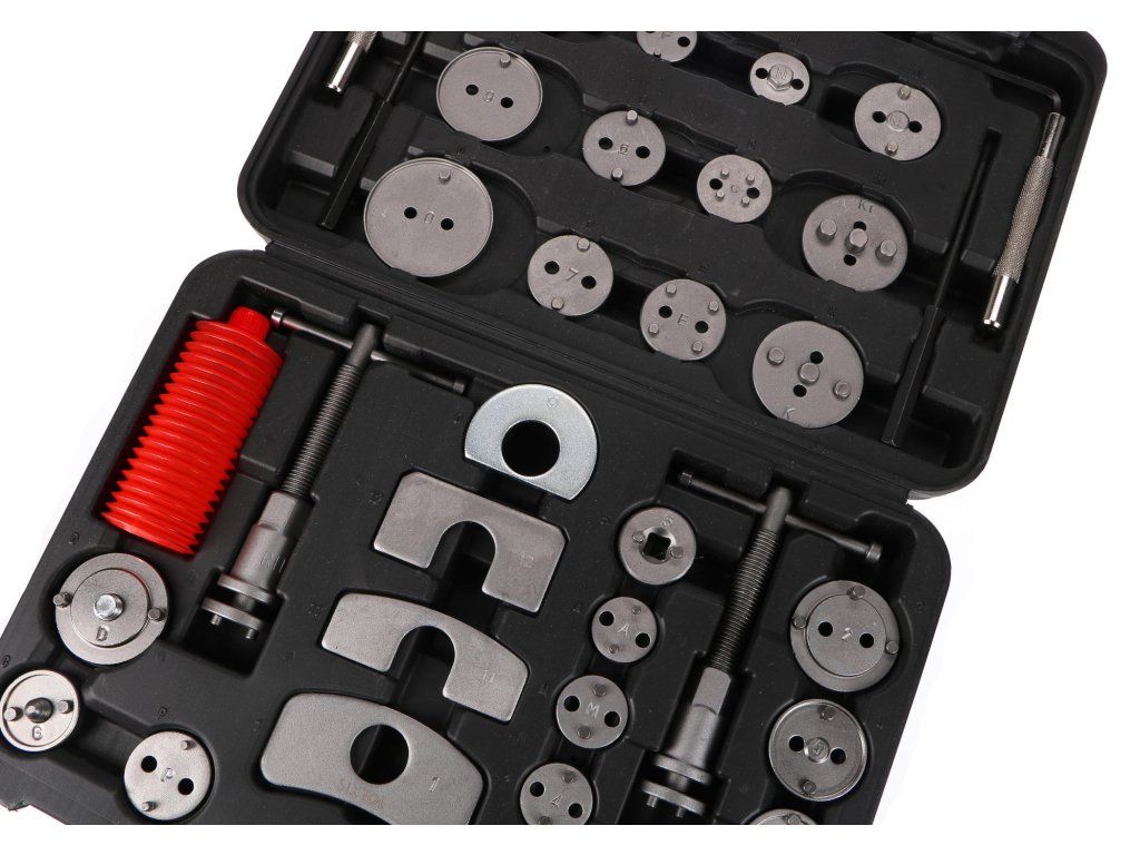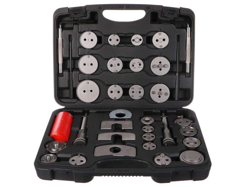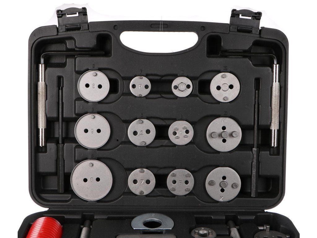 Kompletní sada stlačováků brzdových pístů BRAKE SET BLACK s 35 díly v černém plastovém kufru vhodná k montáži/zpětnému vracení pístů/třmenů kotoučových brzd. Sada obsahuje pravotočivou i levotočivou stlačovací závitnici s magnetem, čtyři dorazy, dva imbusové klče, úderníky, nádobku na mazivo a 24 různých adaptérů. U vozidel s třmeny kotoučových brzd a s integrovanou jednotkou ruční brzdy se zpětné vracení brzdových pístů provádí zpětným otáčením, u ostatních vozidel zpětným stlačením těchto pístů.Obsah sady: