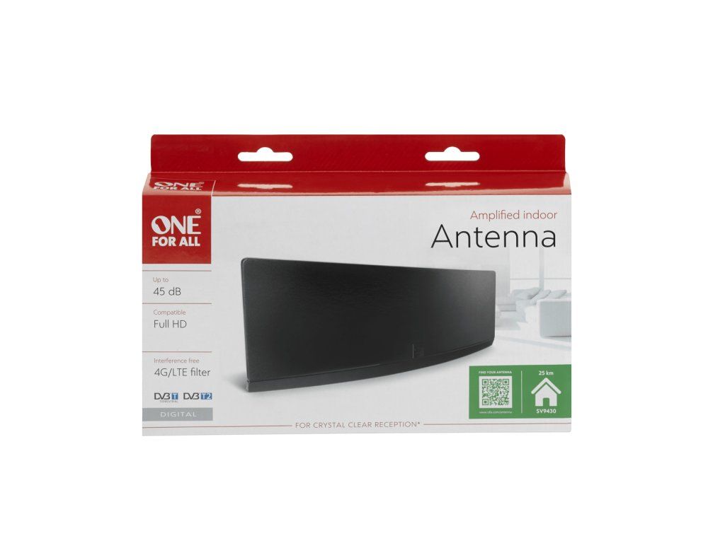 Vnútorná aktívna anténa One For All Amplified Indoor TV Antenna SV9430 s moderným zaobleným dizajnom, ktorá Vám umožní príjem pozemného signálu DVB-T aj DAB so ziskom až 45 dB v lokalitách s dobrým pokrytím tohto signálu.
