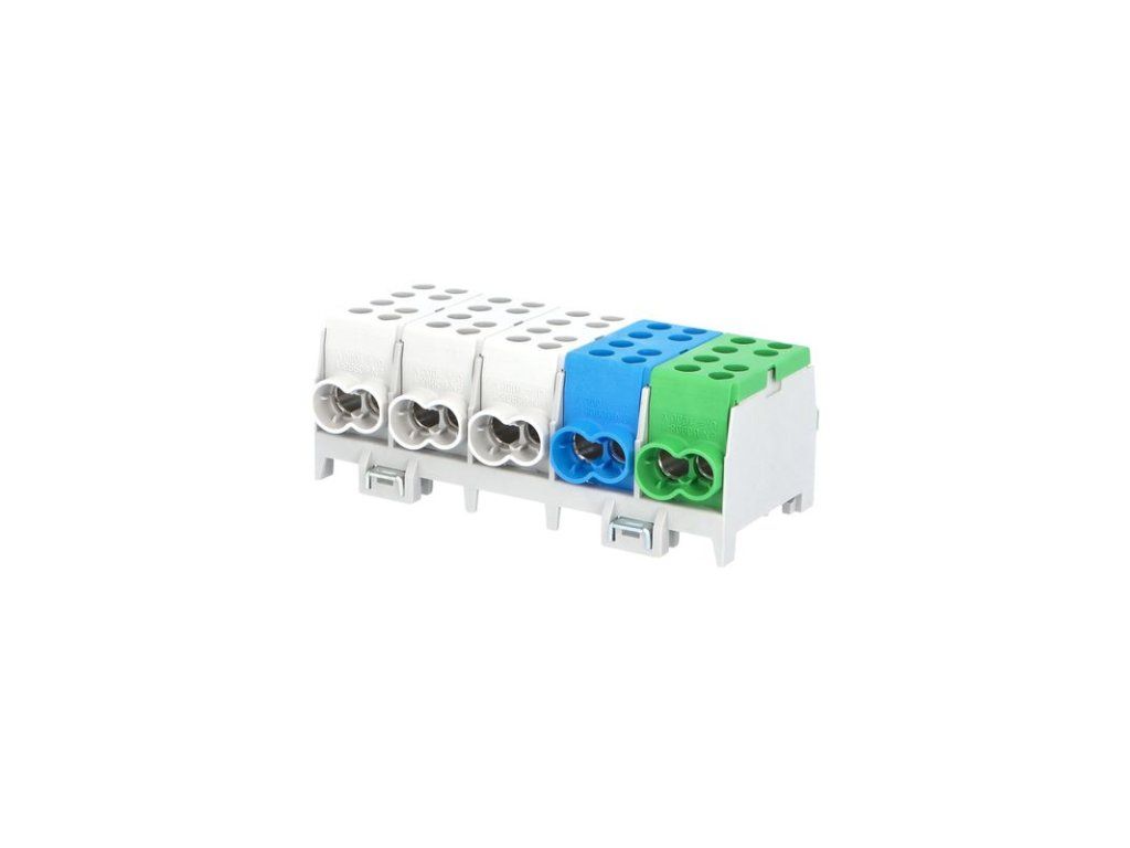 Svorkovnice rozbočovací HLAK 35-5/10 S, 125A, 5pól., AL/CU, IP20, 3xŠ/M/Z, na DIN /2080518. Univerzální rozbočovací (smyčkovací) svorkovnice HLAK typ M2 mohou být použity v rozváděčích nízkého napětí či v dalších aplikacích, kde potřebujeme připojit vstupní kabel a kabel(y) výstupní (smyčkování) a zároveň připojit k napájení přístroje osazeného uvnitř rozváděče. Speciální povrchová úprava svorky umožňuje připojení jak měděných tak hliníkových vodičů. Svorky jsou určeny pro montáž na nosnou lištu (DIN) a jsou řaditelné do sebe. Vodiče se do svorek po odizolování připevňují pomocí šroubového spojení. Šroub dosedá přímo na vodič, proto je nutné jemně slaněné vodiče opatřit dutinkou. Dutinka ale zvětší průřez vodiče a proto je nutné připojovat slaněné vodiče o řád menší než uvedené průřezy. U pevných vodičů toto není nutné. Hlavní přednosti:• Montáž na nosnou lištu