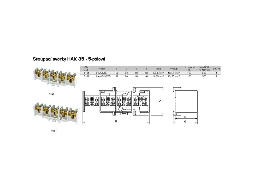 Otevřená 5-pólová svorka HAK/5/35, se vstupy 5x 35mm2 a výstupy 5x 25mm2. Otevřené svorky HAK pro stoupací vedení (krytí IP00) pro použití např. v bytových domech. Hlavní stoupací kabel (vodič) není nutné přerušit, svorky jsou konstruovány pro průběžné napojení odboček. Jsou určeny k instalaci na nosnou lištu (s možností dodatečného upevnění šroubem), mosazná svorka je vhodná pro měděné vodiče, nabízené varianty umožňují odbočení vždy z jednoho pólu dvěma nebo čtyřmi vodiči (respektive s více vodiči u svorky PEN/PE). Vodiče se do svorek po odizolování připevňují pomocí šroubového spojení. Šroub dosedá přímo na vodič, proto je nutné jemně slaněné vodiče opatřit dutinkou. Dutinka ale zvětší průřez vodiče a proto je nutné připojovat slaněné vodiče o řád menší než uvedené průřezy. U pevných vodičů toto není nutné.Dodatočné parametre
