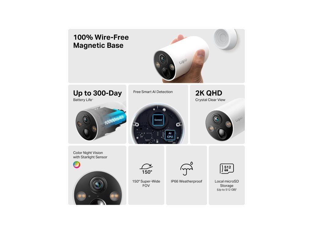 Kamera Obrazový snímač *1/3'' Progressive Scan CMOS Starlight Sensor Objektiv * Ohnisková vzdálenost: 2,1 mm *Světelnost: F2,1 * Zorné pole: 150° (úhlopříčně), 134° (horizontálně), 77° (vertikálně) Noční vidění *850 nm IR LED (49 stop / 15 m) * Plnobarevné noční vidění Osvětlení *4× Vestavěné reflektory Rozhraní a tlačítko *1× tlačítko RESET *1× tlačítko POWER Video a zvuk Maximální rozlišení *2K QHD 4MP (2560 × 1440 px) Snímková frekvence *15/20/(25/30) snímků za sekundu Digitální zoom *12× Komprese videa *H.264 Živé zobrazení *Ano Vylepšení obrazu *3DNR *WDR Audio vstup a výstup * Vestavěný mikrofon a reproduktor Audio komunikace *Obousměrný zvuk s potlačením šumu Hlasitost sirény *94 dB (úroveň měřená ve vzdálenosti 4 palce/10 cm) Úložiště Místní úložiště * Slot pro kartu microSD na fotoaparátu (až 512 GB) Cloudové úložiště *Služby cloudového úložiště Tapo Care (vyžaduje se předplatné) Detekce a Notifikace Senzor *Snímač jednoho pohybu (FOV: 130° horizontálně) *Jediné senzory okolního světla Detekce AI *Detekce pohybu *Detekce osob * Detekce domácích mazlíčků * Detekce vozidel Zóny aktivity *Ano Oznámení o výstupu *Oznámení systému *Oznámení systému pomocí snímku (Služby Tapo Care) Síť Připojení k síti *Připojte se přes Wi-Fi Bezdrátové připojení *IEEE 802.11b/g/n, 2,4 GHz Wi-Fi Bezpečnost Bezpečnostní *128bitové šifrování AES s SSL/TLS *WPA/WPA2-PSKDodatočné parametre