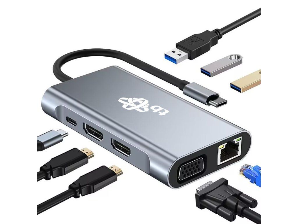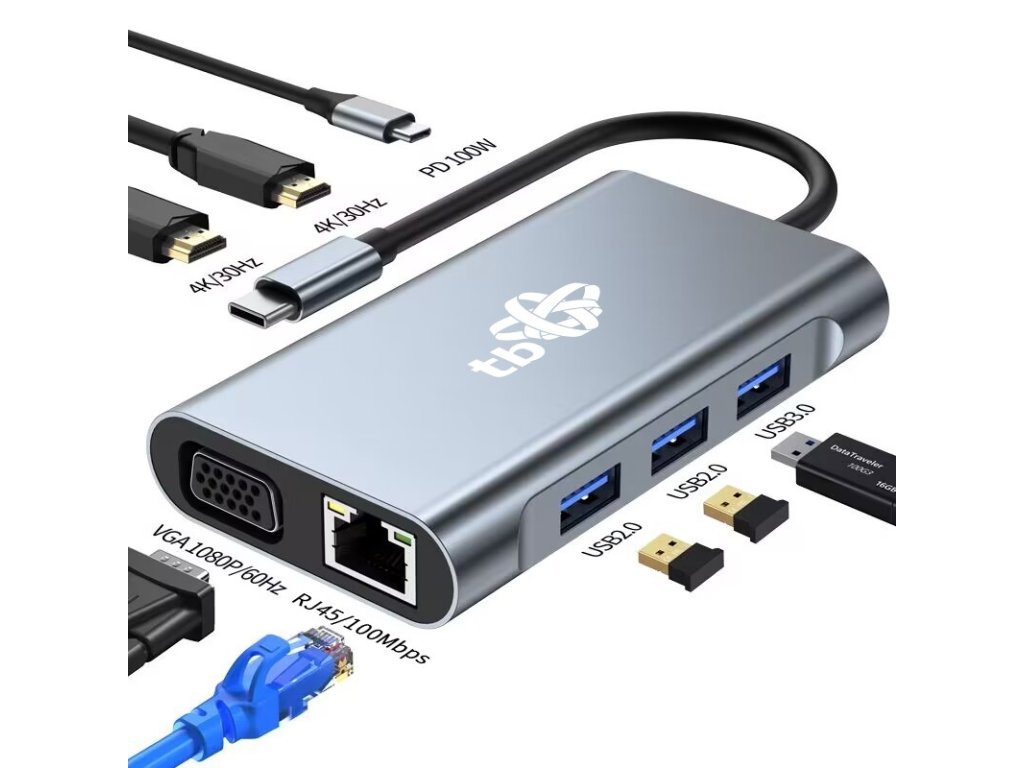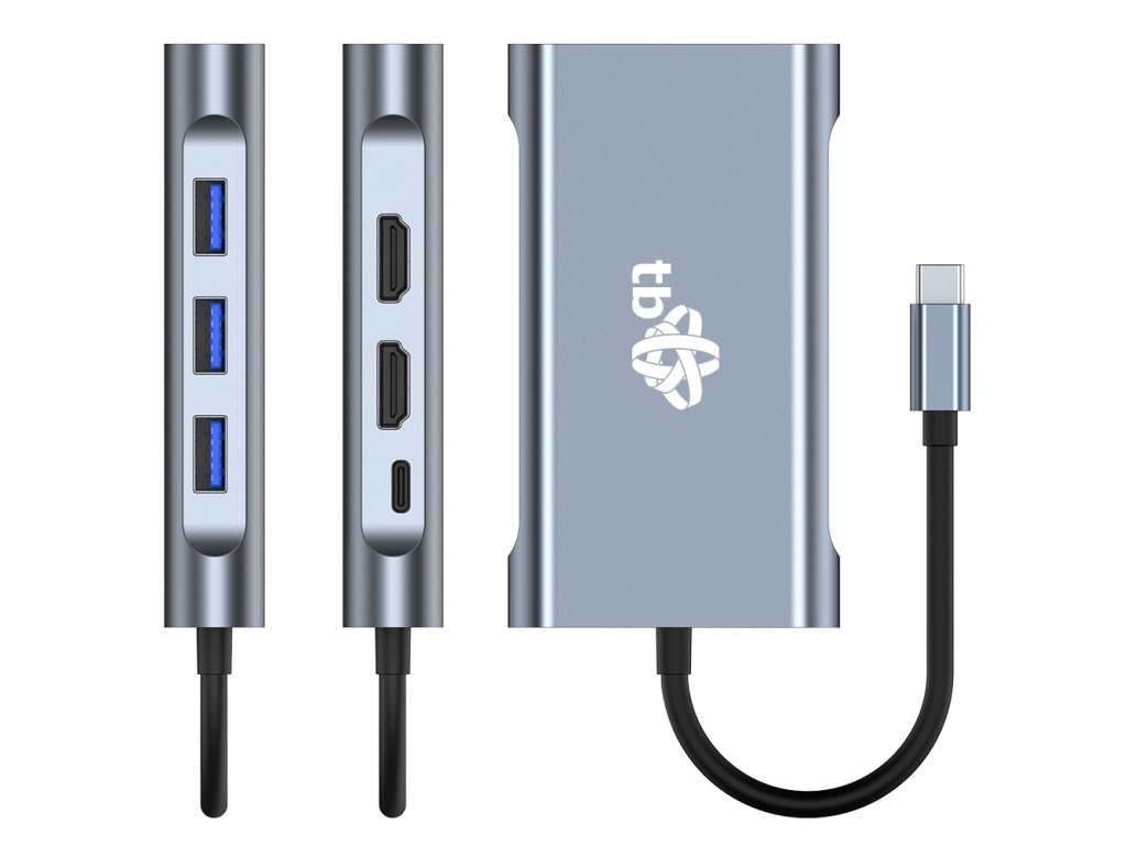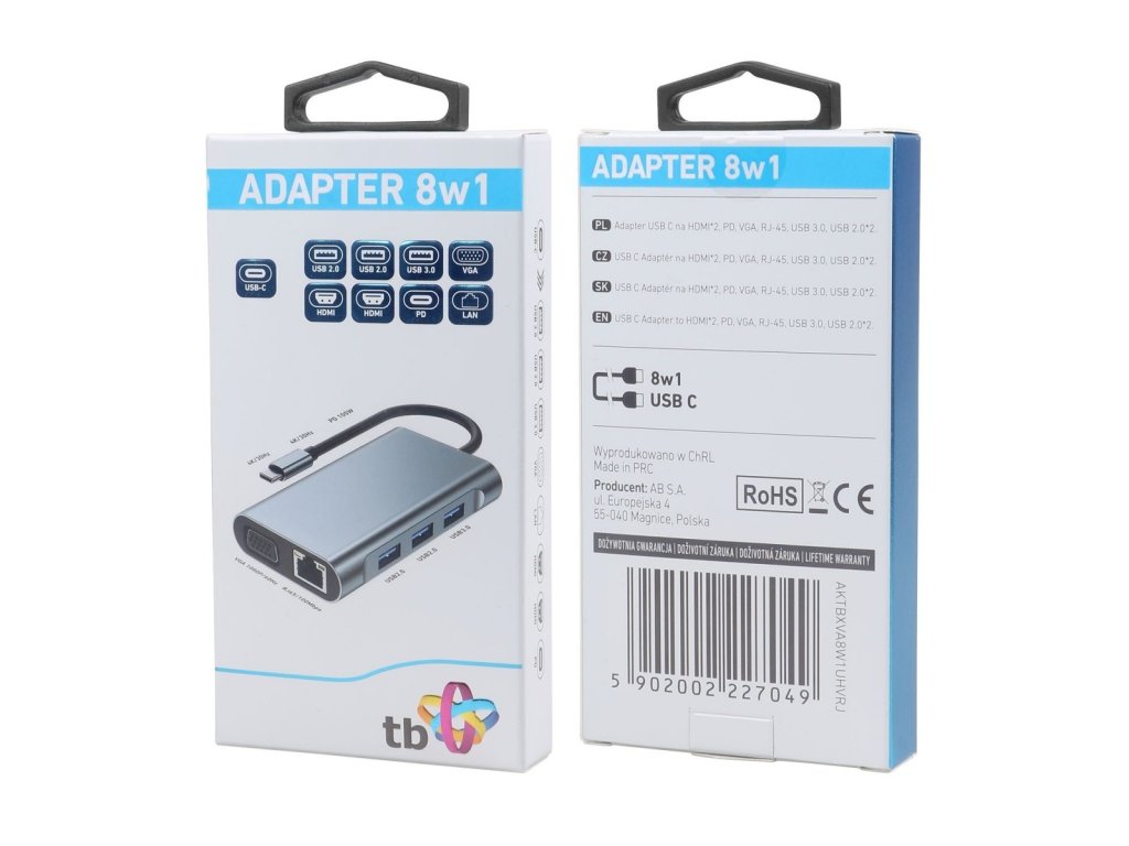 TB TB 8in1 Adapter USB C HDMI x2 USB VGA RJ45 PD Konektory: *1x USB Type C (M) *2x HDMI Type A (F) *1x RJ45 (F) *3x USB Type A Standard: USB 2.0/USB 3.0/USB 3.1 Gen 1Dodatočné parametre