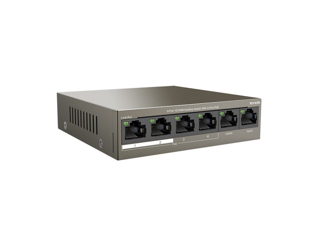 Tenda TEF1106P-4-63W PoE AT switch 4x PoE 802.3af/at, 6x 100Mb/s, PoE celkom 63W, fanless, PoE+