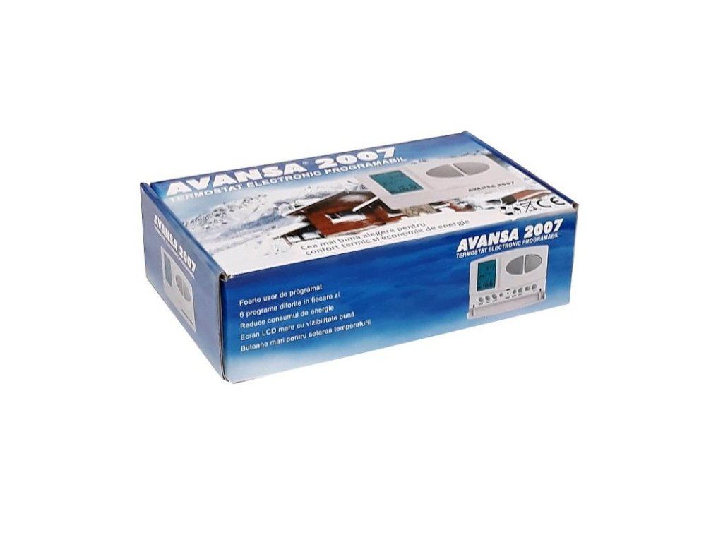 Týždenný termostat Avansa 2007 je vhodný na ovládanie väčšiny kotlov. Termostat možno jednoducho pripojiť ku kotlu alebo ku klimatizačnému zariadeniu s prevádzkovým napätím 24 - 230 V. Izbový termostat je nastaviteľný pre systém s vykurovaním alebo chladením podľa individuálnych potrieb tak, aby zariadenie vykurovalo alebo chladilo miestnosť na požadovanú teplotu. Používa sa na reguláciu teploty v miestnosti. Vďaka vysokému stupňu komfortu zabezpečuje aj zníženie nákladov na energiu. Zariadenie je možné zapnúť 6-krát denne a pri každom zapnutí nastaviť inú teplotu (v krokoch po 0,5 °C).