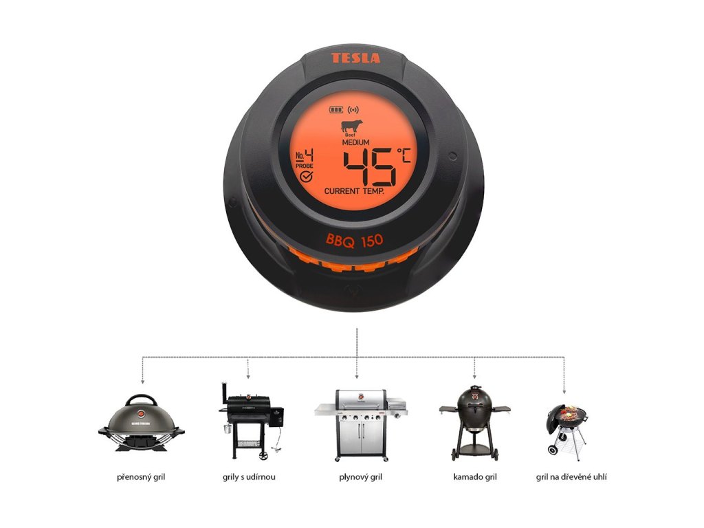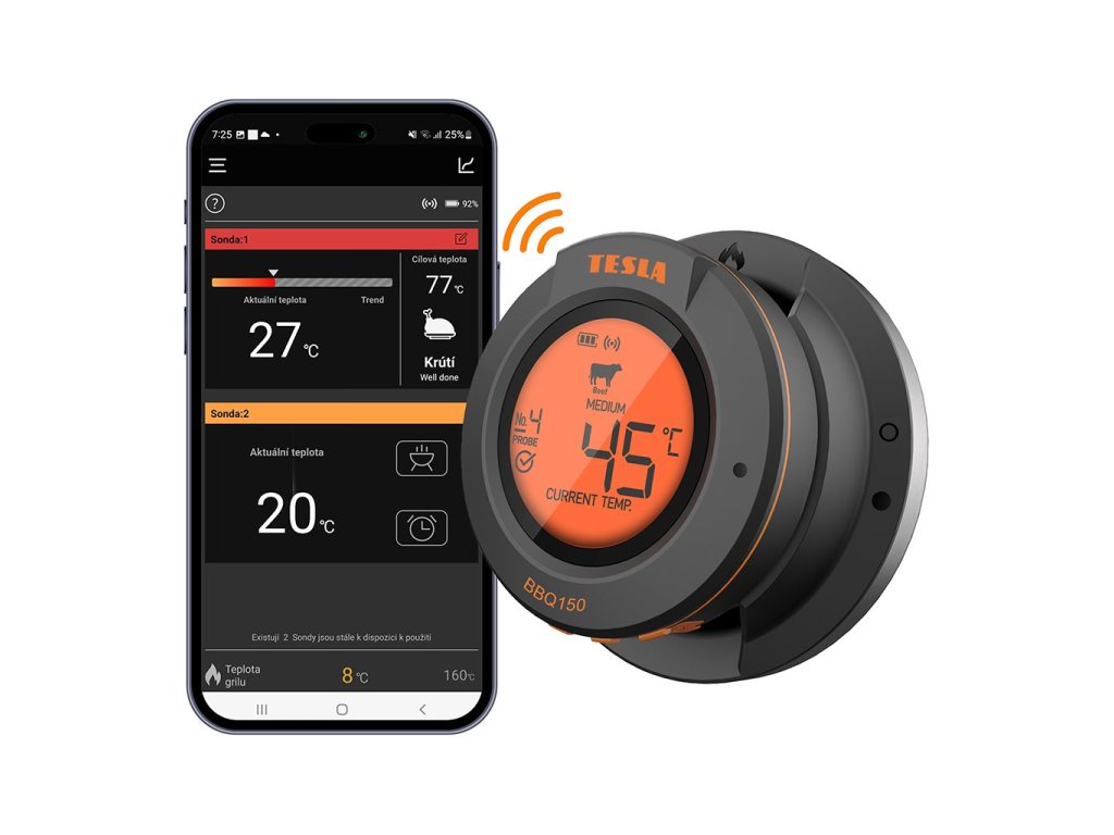 Nahraďte starý analogový teploměr elegantním digitálním LCD displejem, který je kompatibilní s různými typy grilů. I když váš gril není připraven pro montáž teploměru, i tak lze snadno TESLA Cook BBQ150 používat. Bajonetové uchycení umožňuje umístit displej vedle grilu. Je však třeba mít na paměti, že v takovém případě teploměr nebude měřit vnitřní teplotu v grilu. Použití teplotních sond je velmi jednoduché – stačí je vložit do masa a nastavit teplotu pomocí intuitivní mobilní aplikace.