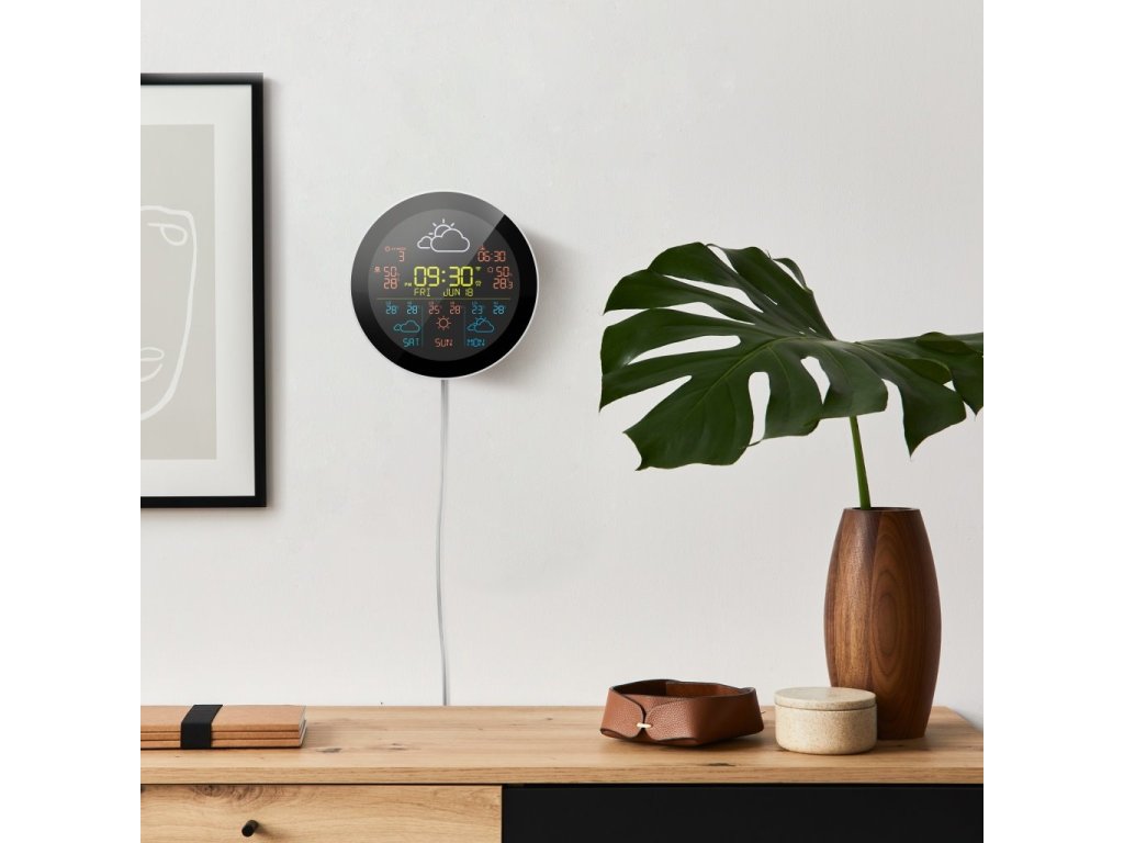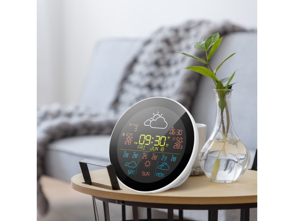 TESLA Device MS360 je chytrá meteostanice s externím senzorem, která přináší přehled o počasí přímo do vašeho domova. S připojením na mobilní aplikaci získáte třídenní předpověď počasí s grafikou, aktuální hodinovou předpověď s grafickým znázorněním, východ a západ slunce a UV index. Navíc můžete sledovat teplotu a vlhkost v místnosti a díky barevnému displeji máte tyto informace vždy na očích.