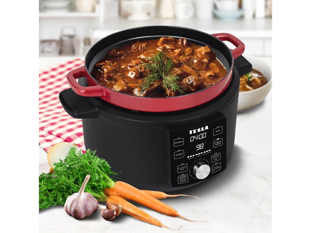V každém balení multifunkčního hrnce TESLA naleznete kuchařku plnou inspirativních receptů. Připravte si dokonale například krémovou polévku, guláš, trhané vepřové, lososa nebo rýžový nákyp. Každý recept je přehledně zpracován krok za krokem a obsahuje doporučené nastavení i čas přípravy, aby byl výsledek vždy perfektní.
