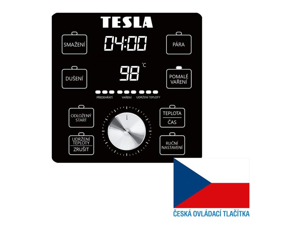 Ovládací tlačítka na předním panelu jsou v českém jazyce, což zajišťuje jednoduchou a intuitivní obsluhu, vhodnou pro všechny uživatele, bez ohledu na jejich zkušenosti s podobnými přístroji. Hrnec je vybaven přehledným digitálním displejem s bílým podsvícením a dotykovými tlačítky pro snadné a rychlé nastavení programu vaření. Po ukončení vaření se aktivuje funkce "Udržování teploty", takže jídlo zůstává teplé a připravené k servírování.