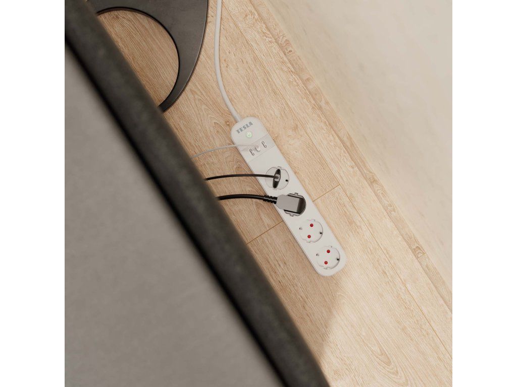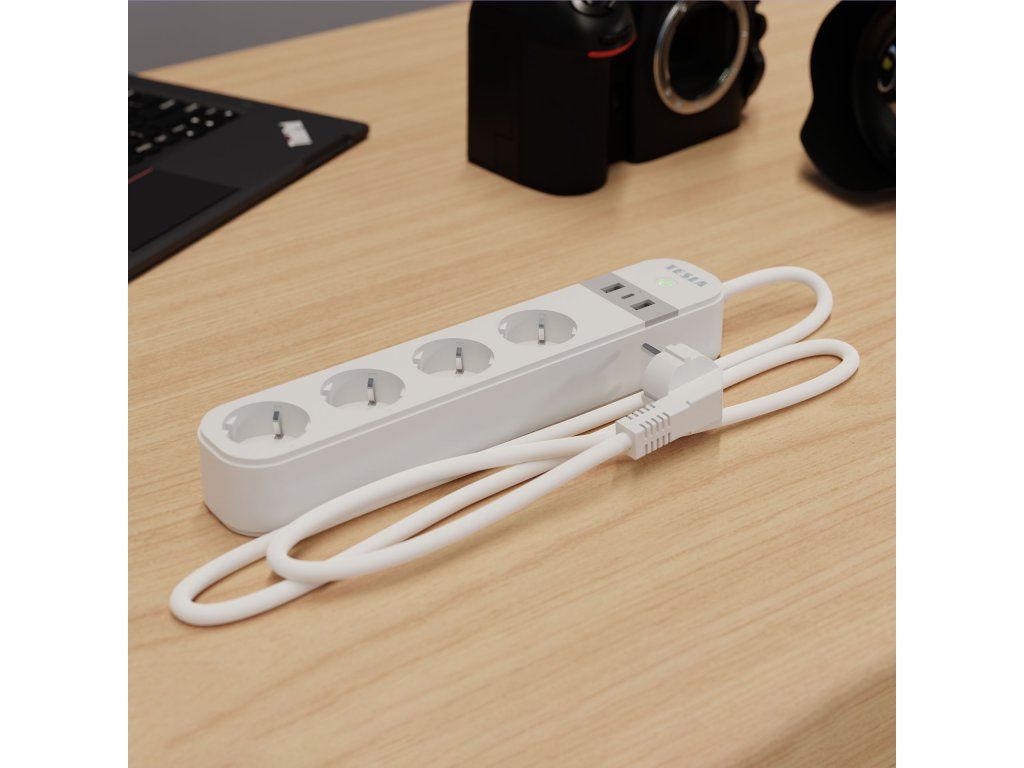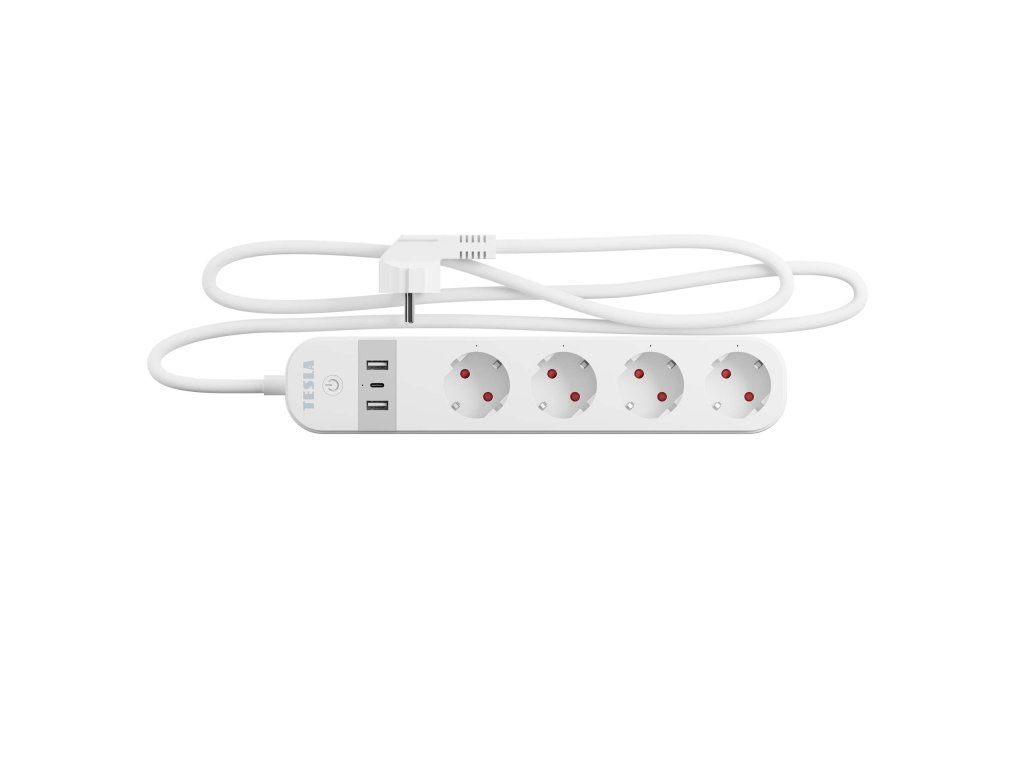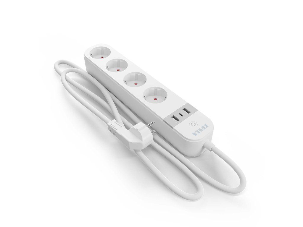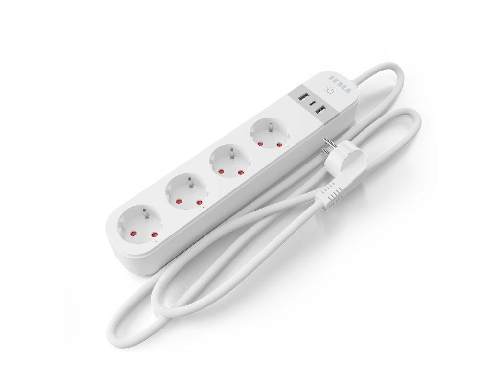 TESLA Smart Power Strip PS300 jde s dobou. Nenabízí totiž jen čtyři obyčejné 220V zásuvky. Vybaven je i dvěma USB-A porty a jedním USB-C. V době USB nabíječek tak přináší komfort pro napájení mobilů, sluchátek a další moderní elektroniky.