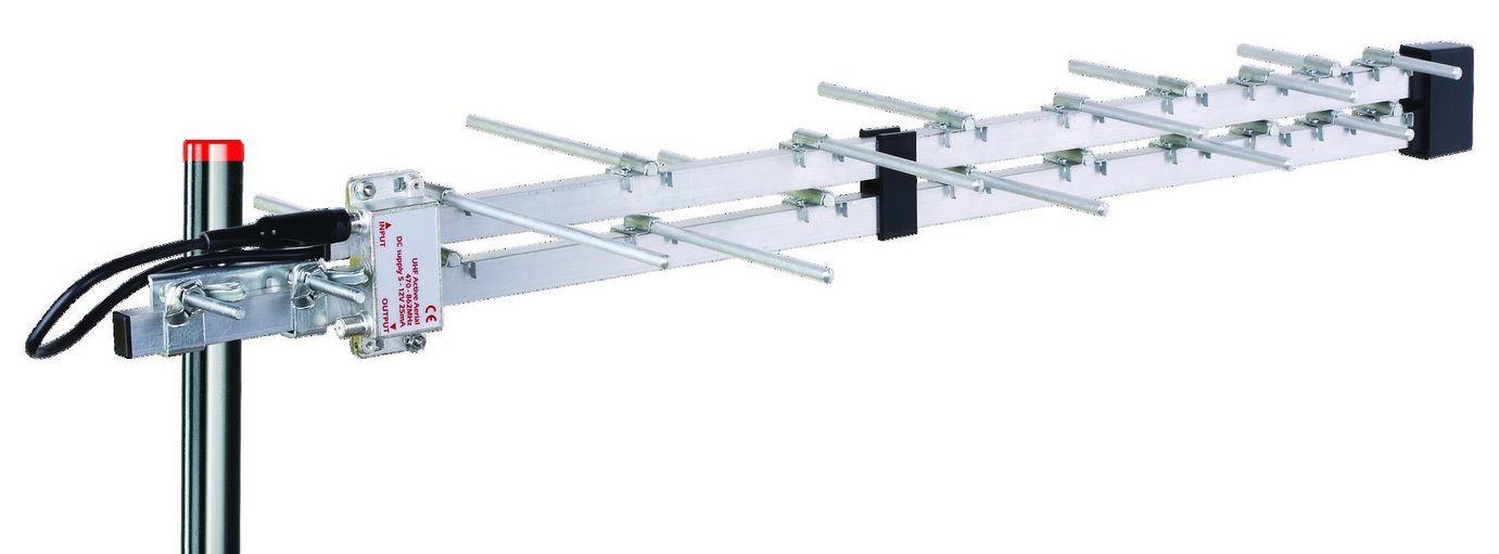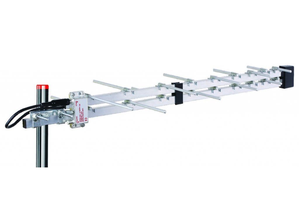 Logaritmicko-periodická venkovní anténa pro příjem DVB-T/T2 signálu včetně aktivního zesilovače se ziskem 30 dBi. Součástí balení je přívodní koaxiální kabel, napájecí výhybka, zdroj a výložník. Montáž je přizpůsobena pro příjem v horizontální nebo vertikální polarizaci. Připojení koaxiálního kabelu na F konektor. Součástí balení je gumová krytka konektoru.